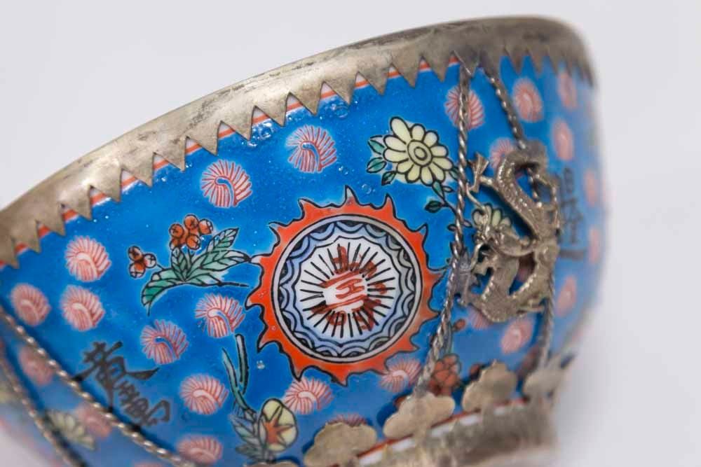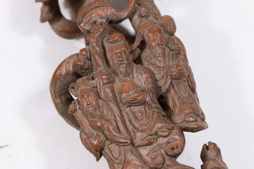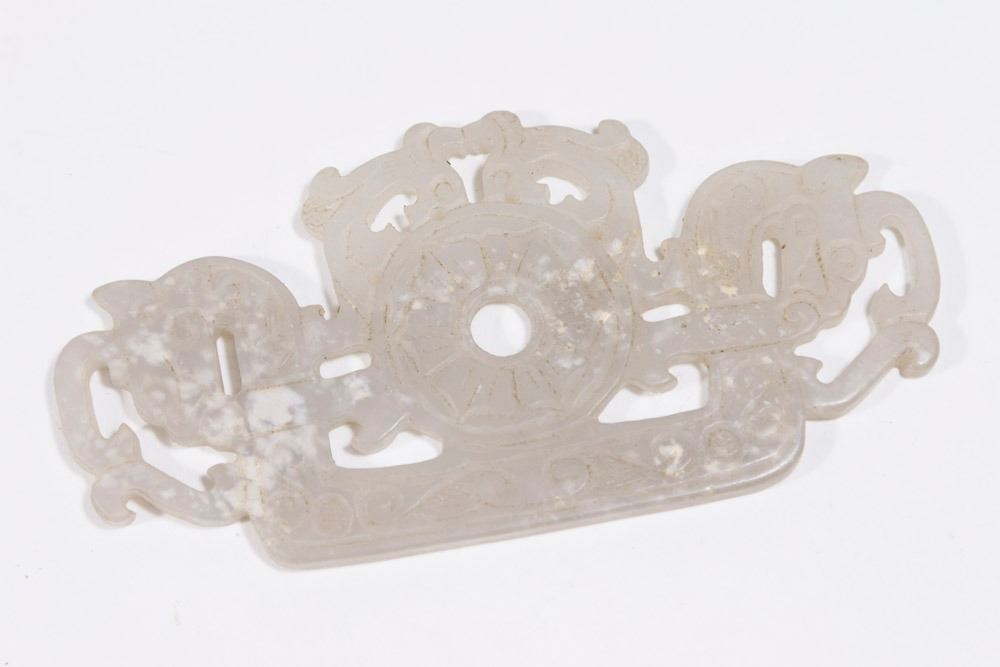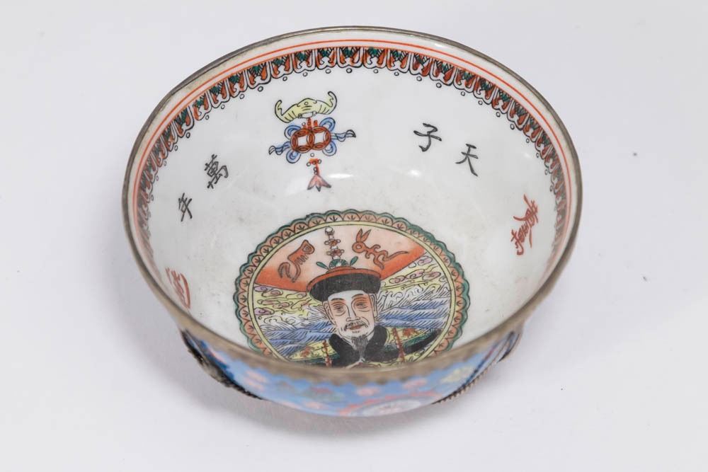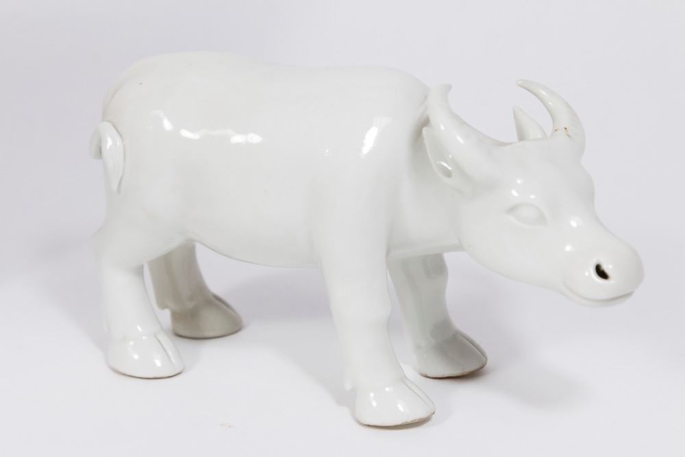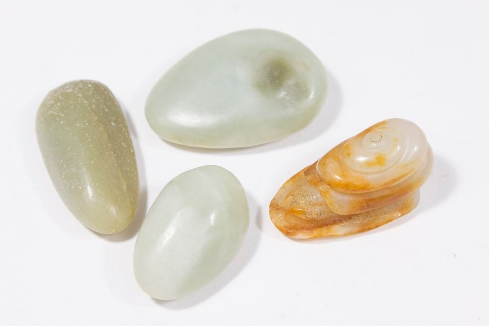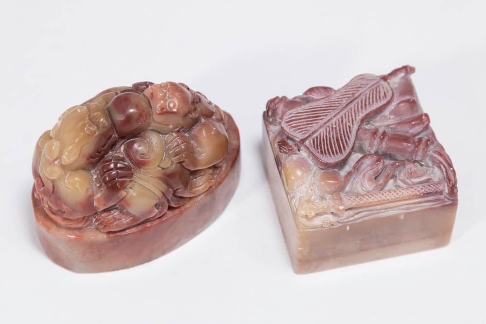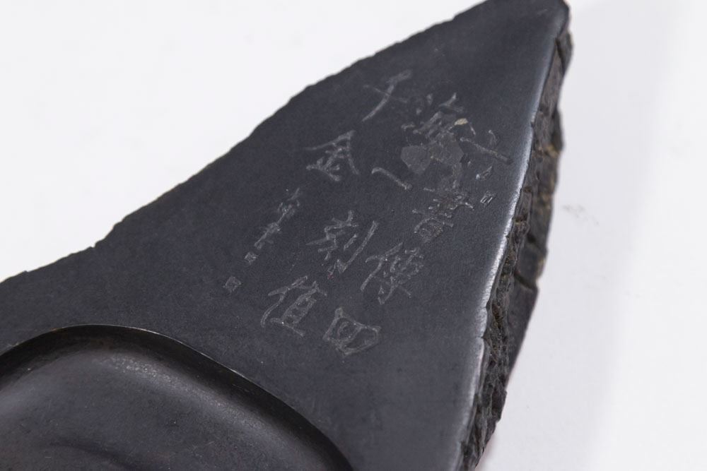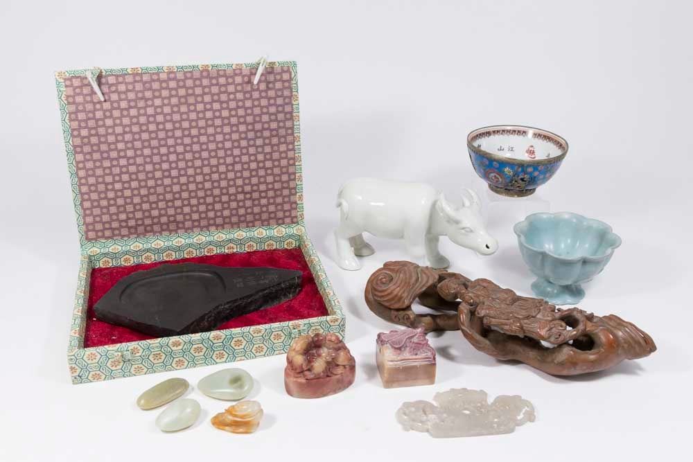 Including jade disc, carved bamboo Ruyi, 2 soapstone stamps, 4 jade stones, blanc-de-Chine water buffalo stamped China, small celadon bowl, porcelain bowl, and large inkstone in original box. Various sizes. 12 pieces.