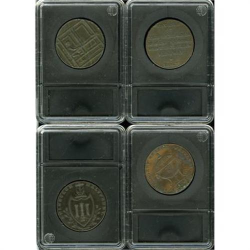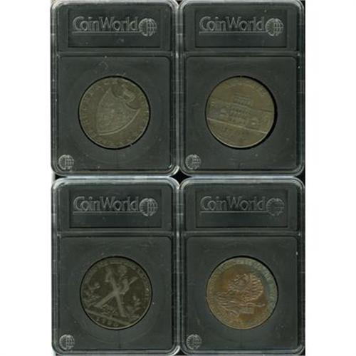 <B>Four-Piece Lot of British 18th Century Conder Tokens.</B></I> Four 18th century British Conder tokens that cover a wide range of subjects and themes. A nice starter set.<BR><BR><b>Shipping:</b> Coins & Currency (<a target="_blank" href="http://www.heritageauctions.com/common/shipping.php">view shipping information</a>)