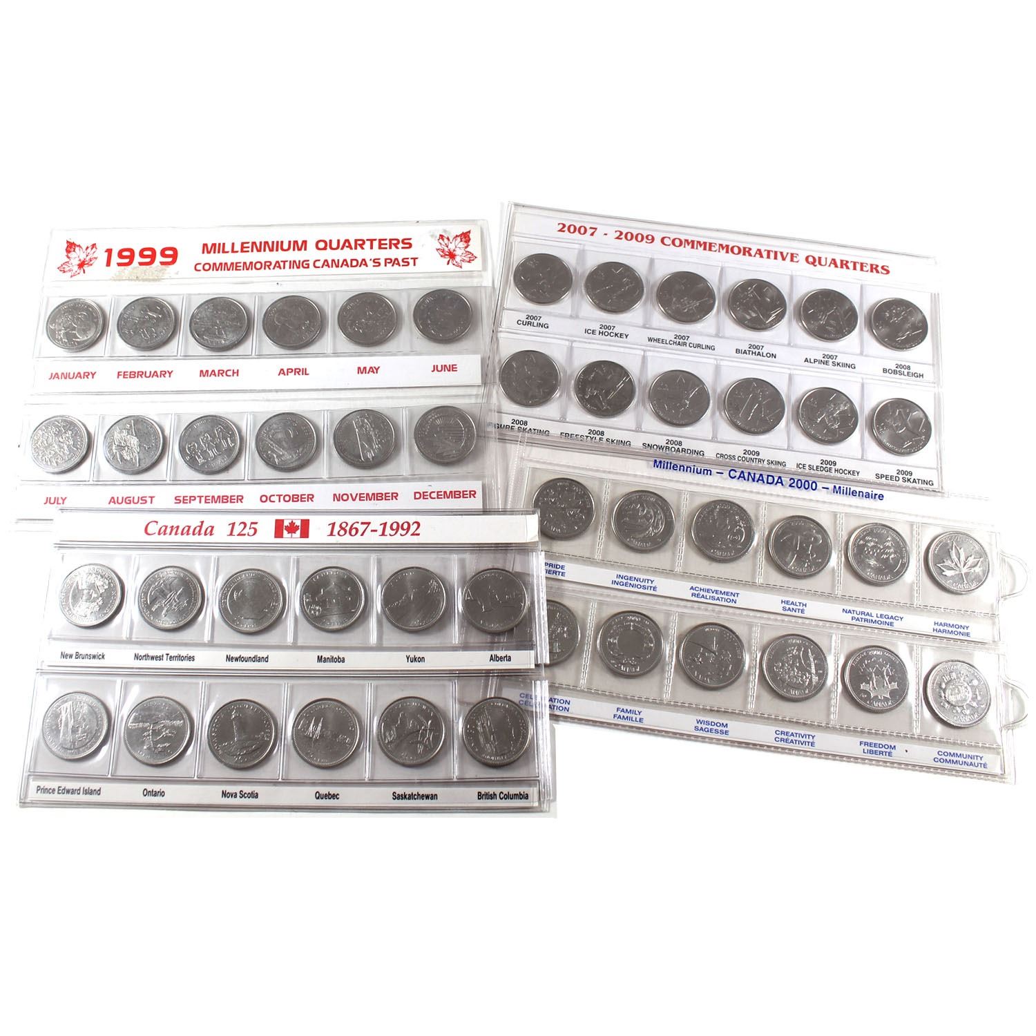 Group Lot of Canada 12-coin 25-cents Commemorative Sets in Plastic Sleeves. You will receive 1867-1992 Provinces, 1999 Millennium, 2000 Millennium & 2007-2009 Olympics. 4 sets.