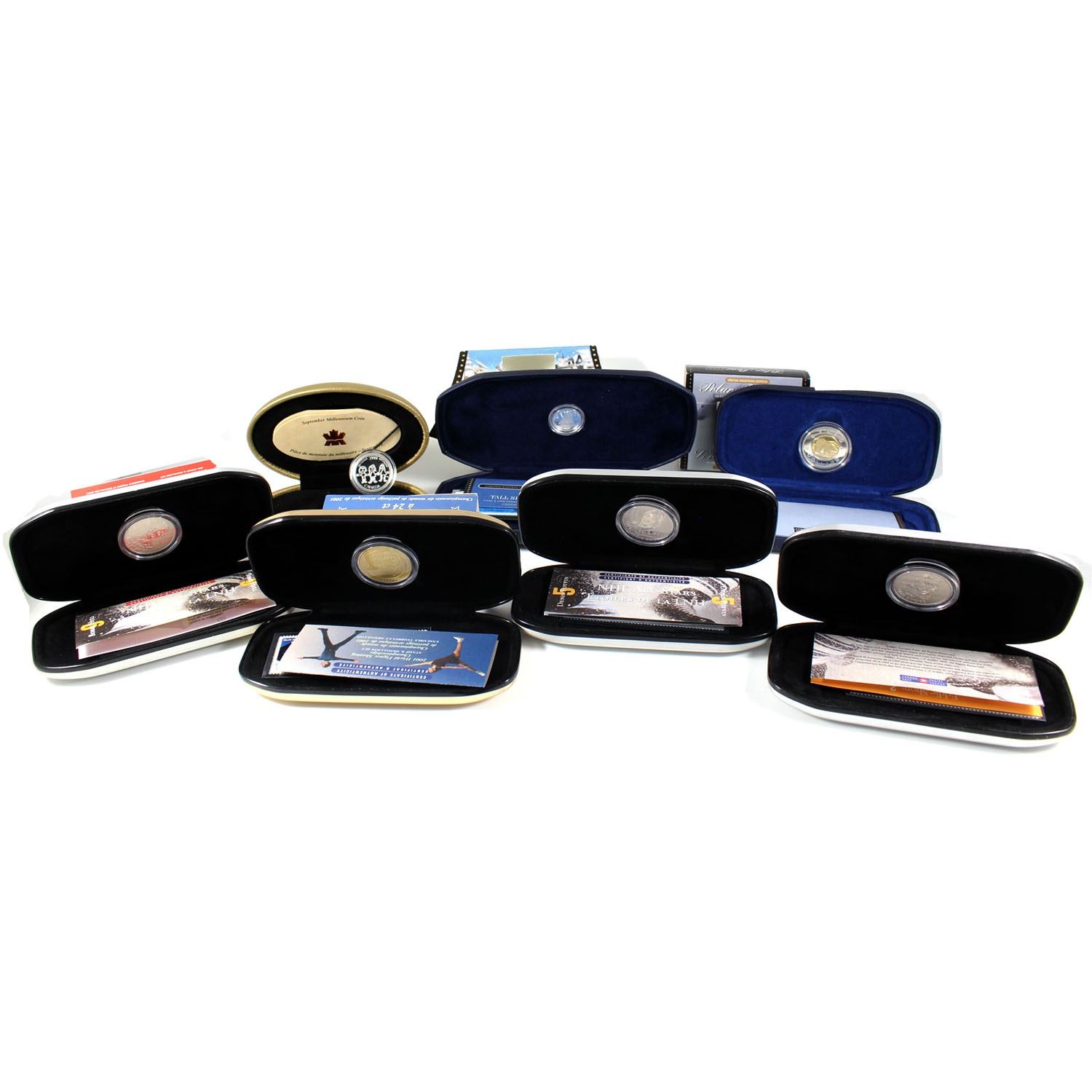 Group Lot of Canada Commemorative Coins: 1999 September Millennium 25-cent, 2000 Polar $2 Coins and Stamp set, 2000 Tall Ship 10-cent Coin & Stamp set, 2001 Denis Potvin NHL All Star medallion & Stamp set, 2001 Eddie Shore NHL All Star Medallion Coin and Stamp Set, 2001 Bobby Hull NHL All Star Medallion & Stamp set & 2001 World figure Skating Championship Medallion Stamp & Coin Set. Some medals are toned and missing outer packaging or packaging is impaired. 7pcs