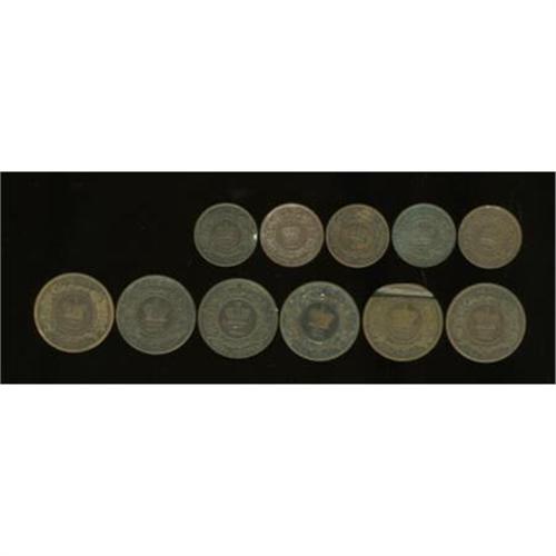 <B>Group Lot of Canadian Maritime Coinage (Tokens).</B></I> Copper. Eleven varied coins from Nova Scotia and New Brunswick. These fall into the category of coinage as they were in use for a very short period of time during the early 1860s.<BR><BR><b>Shipping:</b> Coins & Currency (<a target="_blank" href="http://www.heritageauctions.com/common/shipping.php">view shipping information</a>)