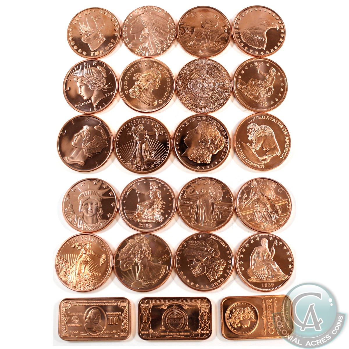 Group Lot of Copper Rounds and Bars. You will receive all different designs. There are 20x Rounds and 3x bars. 23pcs (TAX Exempt)