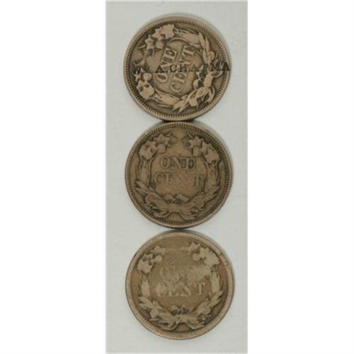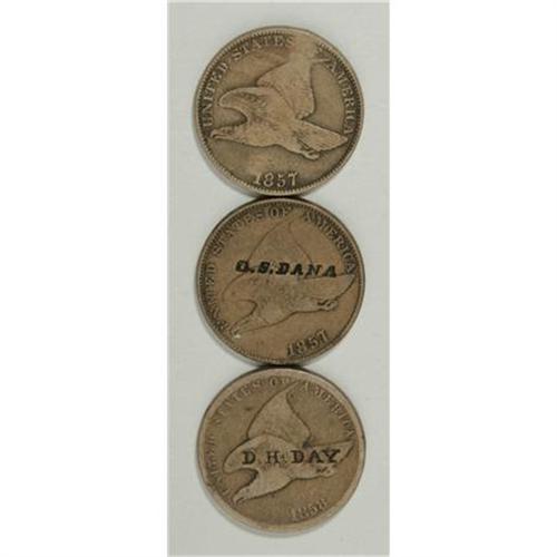 <B>Group Lot of Counterstamped Flying Eagle Cents.</B></I> A trio of Flying Eagle cents with the following counterstamps: <B>1857 G.S. Dana; 1857 Wm. A. Chapman; </B></I>and<B> 1858 D.H. Day.</B></I> A neat lot that is in need of further research.<BR><BR><b>Shipping:</b> Coins & Currency (<a target="_blank" href="http://www.heritageauctions.com/common/shipping.php">view shipping information</a>)