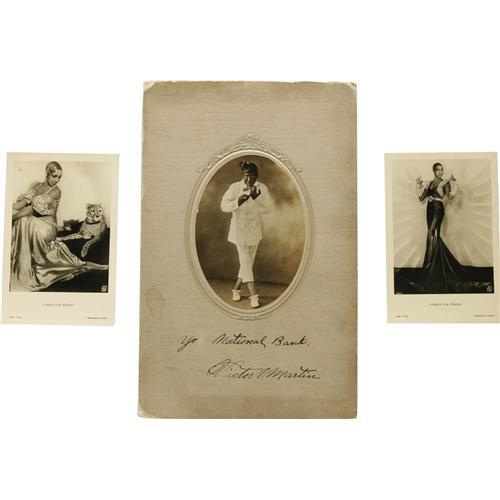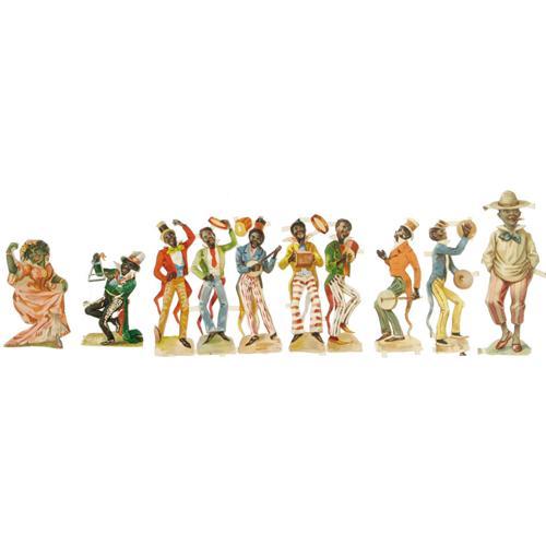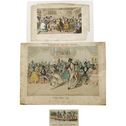 <B>Group Lot of Early Black Ephemera</B></I> consisting of cards picturing Josephine Baker, advertising and diecut paper, and two very early prints picturing Black scenes. Dating from the early 1800s these two prints are in fine condition, although the borders on both show aging and edge damage. Often used to decorate cakes or party favors the diecut figures are colorful and exquisite, measuring approximately 3". Another highlight of this grouping is the photograph of an early minstrel blackface, autographed by the actor himself. This interesting lot is full of collectible treasures.