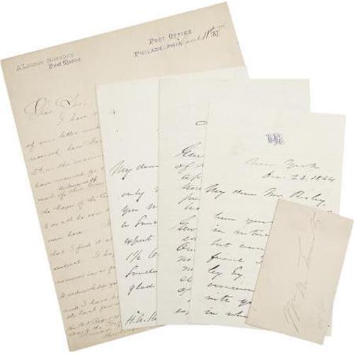 <B>Group Lot of Five Autographs</B></I> includes: <B>William M. Evarts,</B></I> ALS, New York, Feb. 13, 1861; <B>A. Loudon Snowden,</B></I> LS, Philadelphia, Mar. 11, 1878, with good content regarding collecting autographs of notables of his day; great content <B>John Harlan</B></I> ALS, Louisville, KY, April 2, 1877, being a letter of recommendation for Union General Speed S. Fry; and a <B>William M. Evarts</B></I> ALS, Washington, Dec. 26, 1864, and a signature on a card . All items are in near fine condition. <I>From the collection of Henry E. Luhrs.</B></I><BR><BR><b>Shipping:</b> Miscellaneous Collectibles, Smal (<a target="_blank" href="http://www.heritageauctions.com/common/shipping.php">view shipping information</a>)