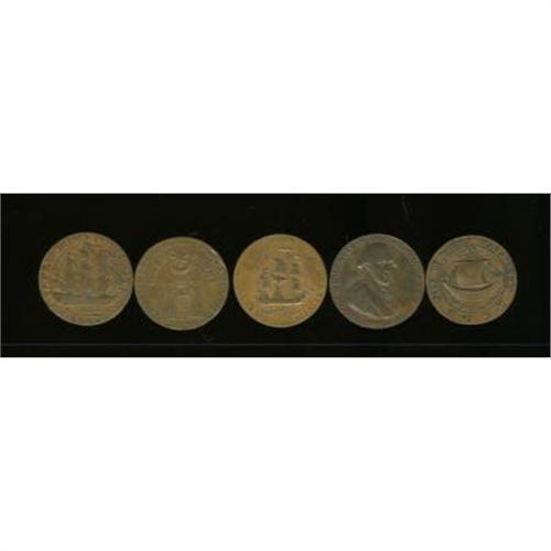 <B>Group Lot of Five Halfpenny Conder Tokens, XF-AU Uncertified.</B></I> Five XF-AU copper halfpenny British Conder tokens from the 1790s. The lot contains: DH-46, 1792, Isle of Wight; DH-40, 1794 Hampshire/Gosport; DH-53e, 1794, Hampshire/Portsmouth; DH-48, 1796, Hampshire/Gosport; DH-60a, 1797, Hampshire/Portsmouth. <BR><BR><b>Shipping:</b> Coins & Currency (<a target="_blank" href="http://www.heritageauctions.com/common/shipping.php">view shipping information</a>)
