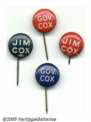 <B>Group Lot of Four Tiny James Cox Buttons</B></I> James M. Cox (1870-1957), Governor of Ohio 1913-1915, unsuccessful Democratic candidate for U.S. President in 1920. One-half inch buttons in matching colors. The two "Jim Cox" examples each show very minor foxing, but the <I>important</B></I> two, reading "Gov. Cox," are in great shape. These are quite scarce. Lot:262