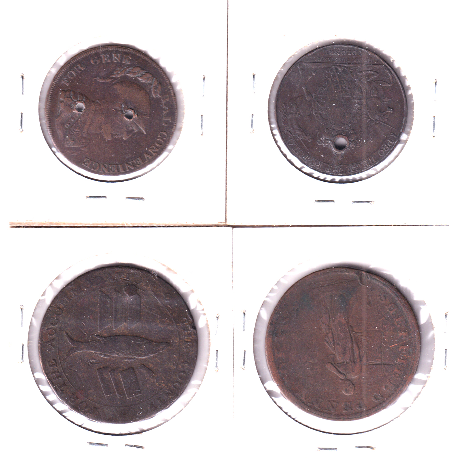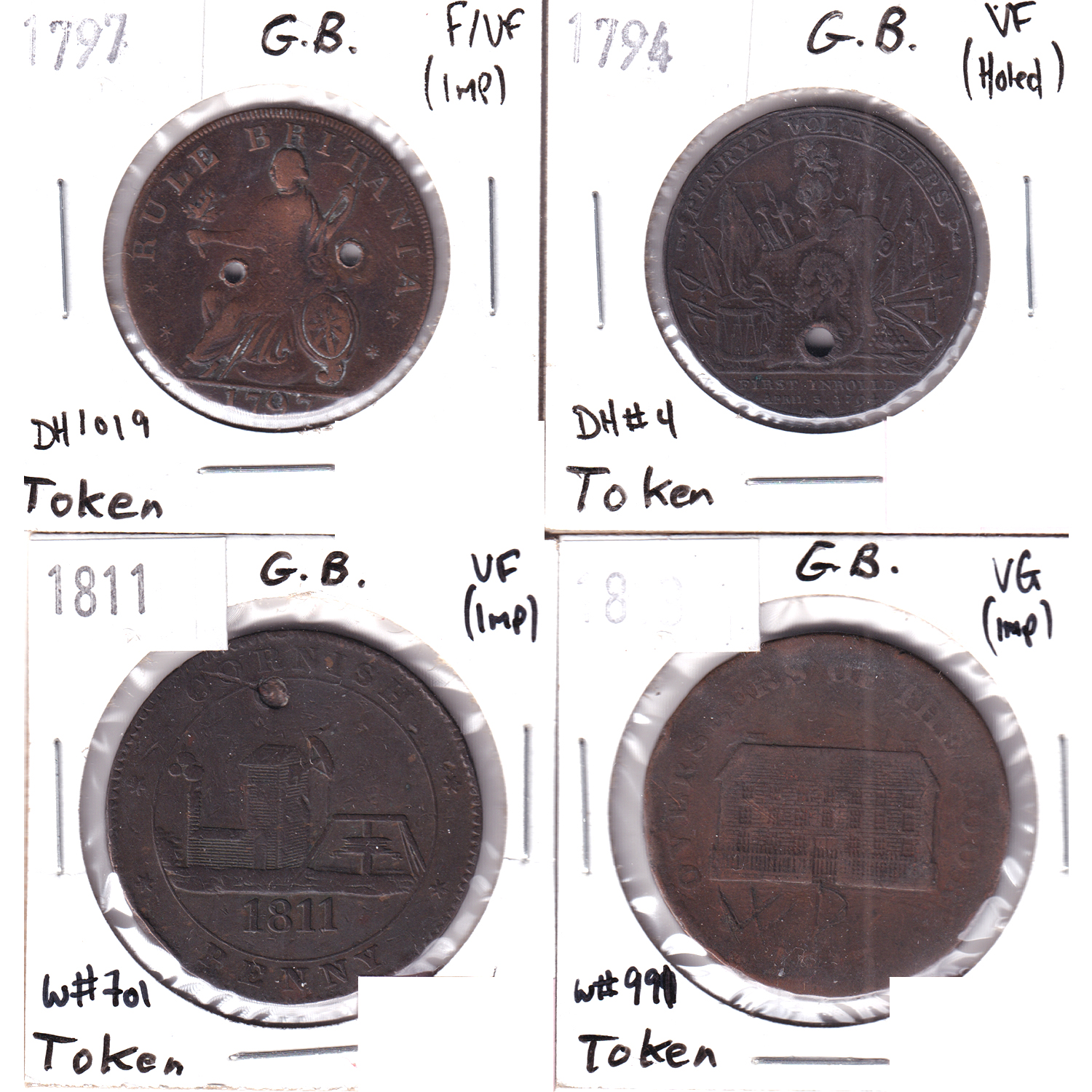INCLUDES: DH# 4 1794 Penryn Volunteers token VF (Holed), DH# 1019 1797 Rule Britainnia token F-VF (impaired), W# 991 1813 Sheffield Penny token VG (impaired), & W# 701 1811 Cornish Penny token VF (impaired). 4pcs.