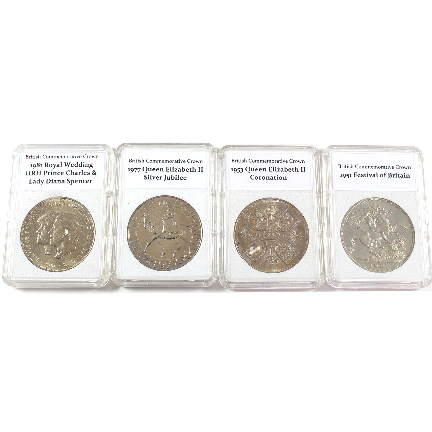 INCLUDES: 1951 Festival of Britain, 1953 Queen Elizabeth II Coronation, 1977 Queen Elizabeth II Silver Jubilee, & 1981 Royal Wedding HRH Price Charles & Lady Diana Spencer. Coins are toned. 4pcs.