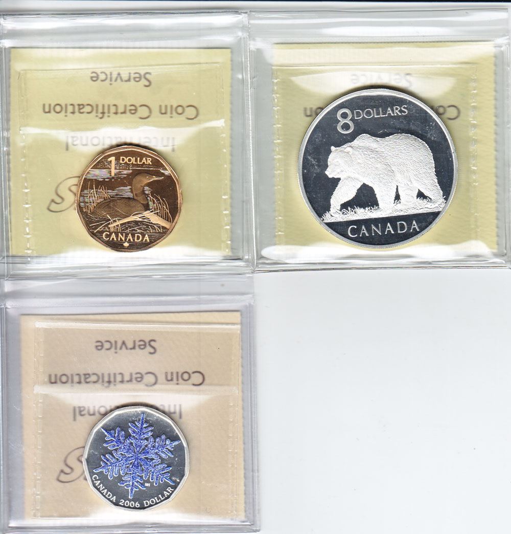 Group Lot of ICCS Certified Proof Commemorative Coins. Lot Includes, 2004 Silver $8 Great Grizzly PF68 UHC, 2004 Elusive Loon PF67 UHC, & 2006 Silver Loon Snowflake PF67 UHC.