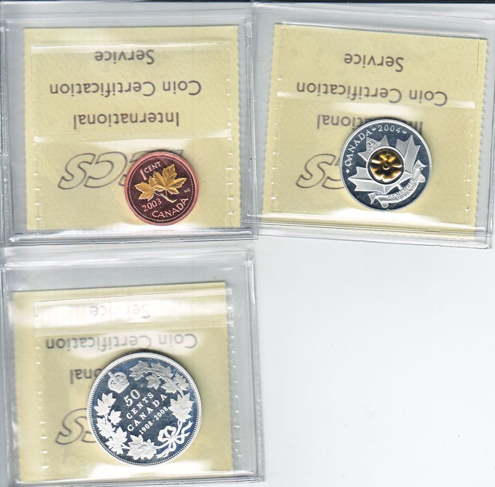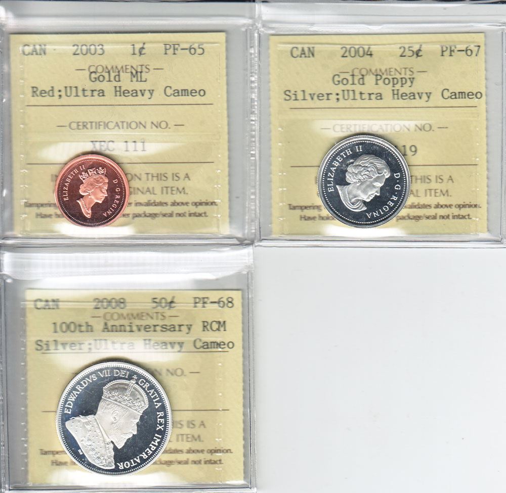 Group Lot of ICCS Certified Proof Commemorative coins. Lot includes, 2003 Gold Plated 1-cent PF65 UHC, 2004 Gold Plated Poppy 25-cent PF67 UHC, & 2008 100th Ann. RCM 50-cent PF68 UHC.