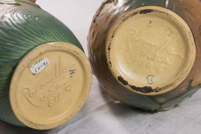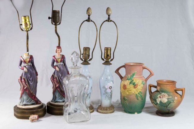 Including 2 pairs of lamps, 2 Roseville vases, and glass etched decanter. Various sizes. 7 pieces total. One lamp figure as-is. Lamps need new wires.