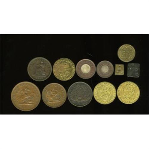 <B>Group Lot of Miscellaneous British and Canada Patterns, Tokens, And Weights, Uncertified.</B></I> An interesting group that includes a pair of undated British pattern coins (models): a halfpenny and a penny, each with silver centers surrounded by copper. Also included are 1857 halfpenny and penny tokens from the Bank of Upper Canada, British brass gaming tokens, two miscellaneous Canadian tokens, and three "weights" from approximately 1700 that appear to be made of brass (two pieces) and iron (one piece). One of the brass pieces is round and marked as a GUINEA; the other two pieces are smaller, marked only with circular indentations, and square-shaped. The average grade of the items is approximately VF. <BR><BR><b>Shipping:</b> Coins & Currency (<a target="_blank" href="http://www.heritageauctions.com/common/shipping.php">view shipping information</a>)