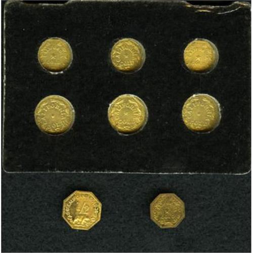 <B>Group Lot of Miscellaneous California "Gold" Charms.</B></I> Gold-plated. Eight various types of California "gold" charms with six in a plastic case for display. These are not the new modern pieces normally seen in the marketplace.<BR><BR><b>Shipping:</b> Coins & Currency (<a target="_blank" href="http://www.heritageauctions.com/common/shipping.php">view shipping information</a>)
