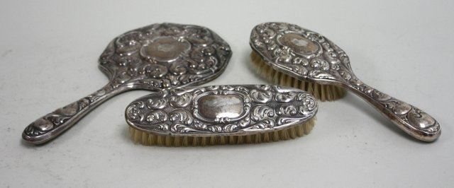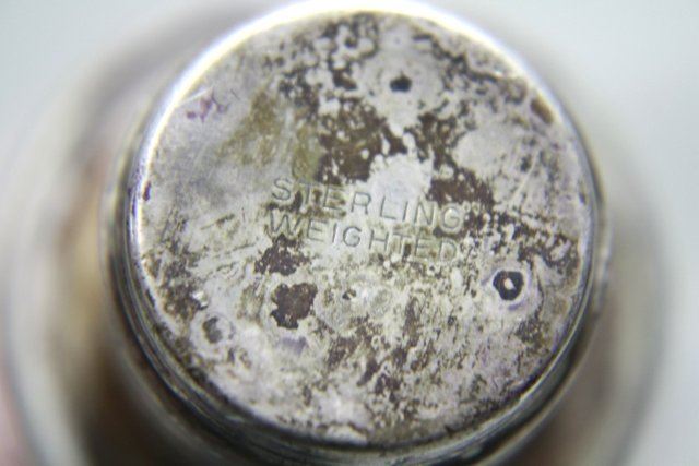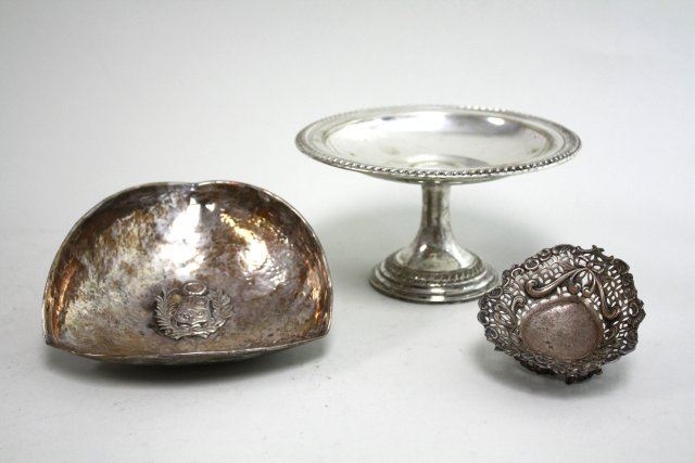 Including, compote, 2 trays, candelabra, bowl, 2 pair salt & pepper shakers, 6 shot glasses, 3 piece vanity set, 3 serving pieces. 20 pieces total. Weighable silver approx. 18 ozt. Minor wear. Candelabra missing base.