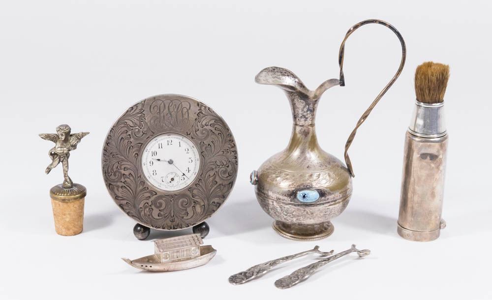 Including etched frame, clock, boat-form snuff bottle, travel shaving mug & case, 2 art nouveau figural forks, cork, and ewer. Approx. 3.10 ozt (96.89 g).