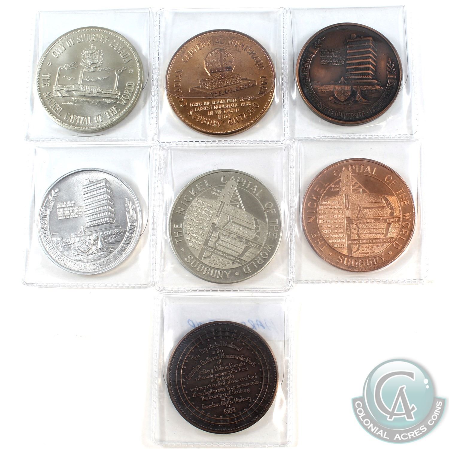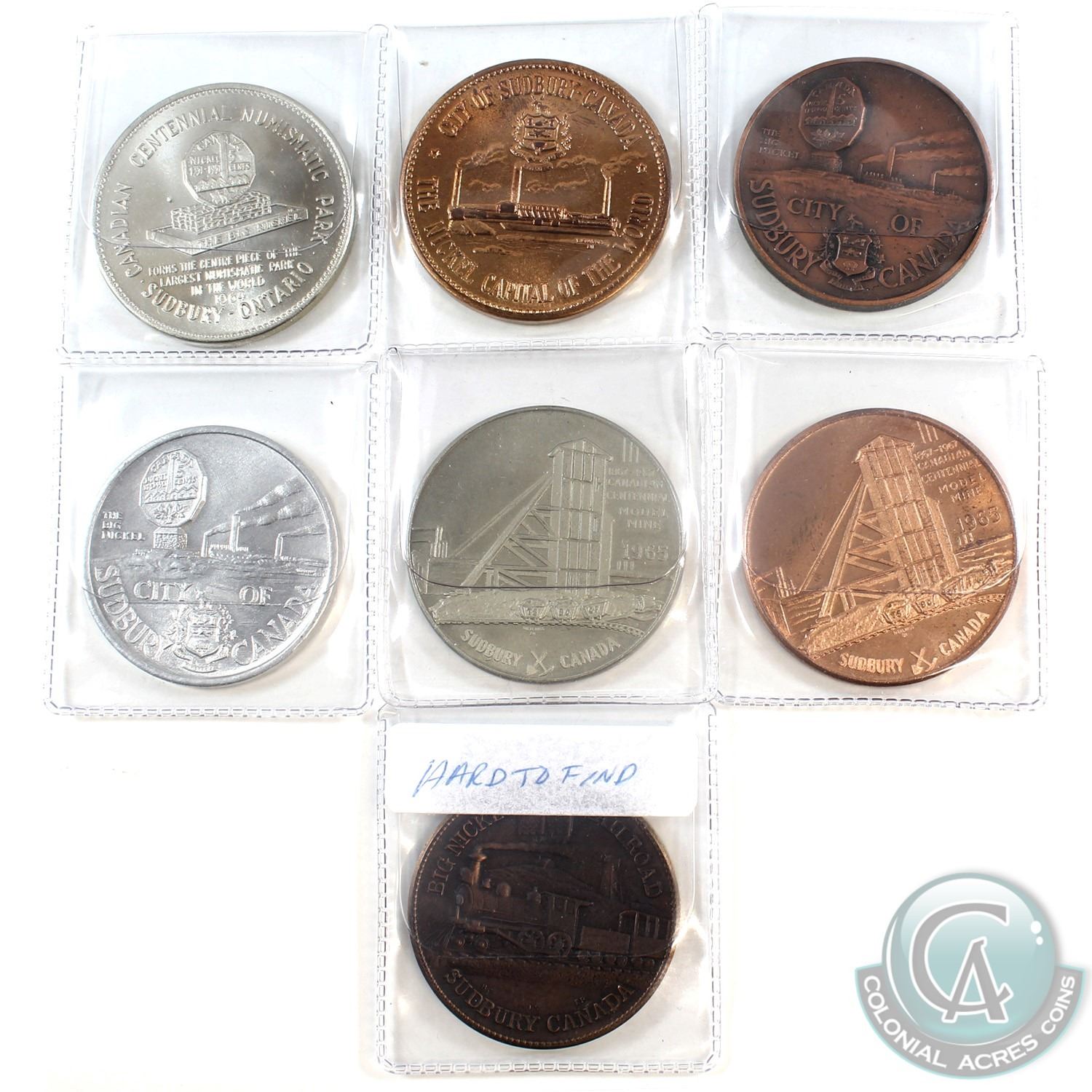 Group Lot of Sudbury Medallions. You will receive 4 different designs, 3 of which have the same design with a bronze or copper and white metal version. Included is a harder to find 'Big Nickel Railroad' commemorating the only numismatic train in the world, built in 1969. 7pcs