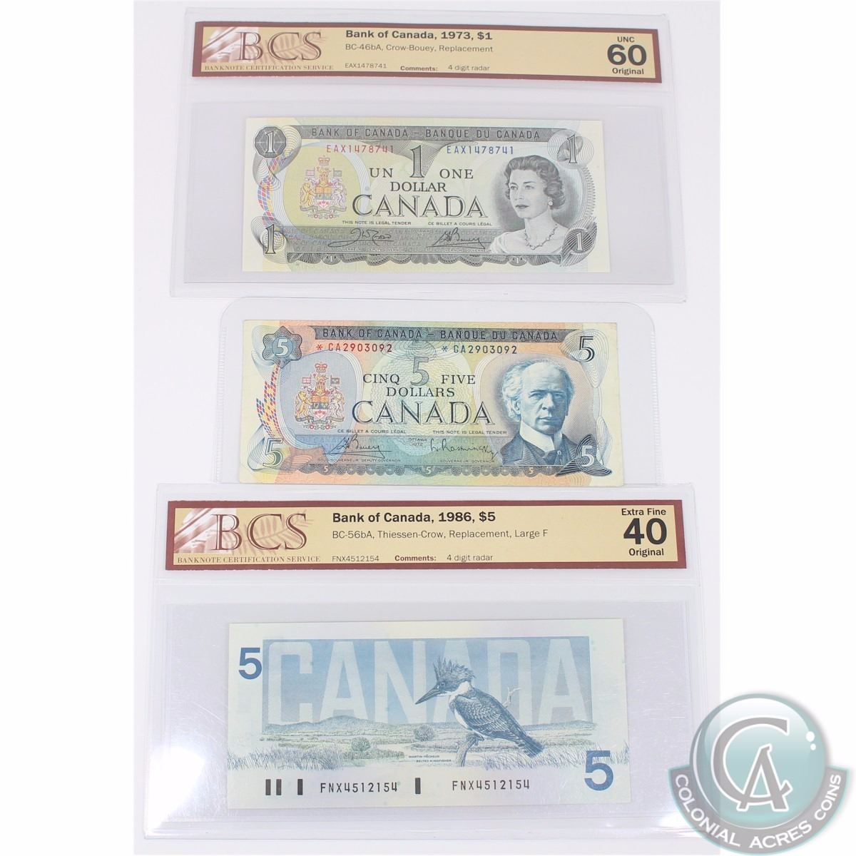 Group Lot of Three 4 digit RADAR Replacement notes. Included is a 1973 $1, a 1972 $5 and a 1986 $5.