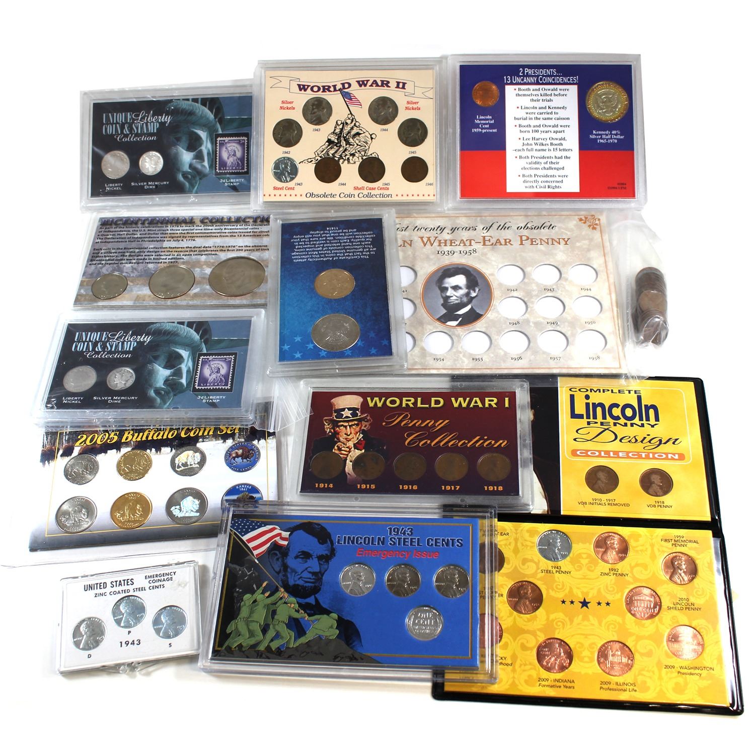 *Group Lot of USA Special Issued sets; 2005 Buffalo Set coloured/Gold-Plated, complete Lincoln Penny Set, Lincoln Wheat-ear Penny Collection, 2013 Lost Coins Never Released, 2 x Unique Liberty Coin & Stamp Set, WWI Penny Collection, 1943 Steel Lincoln Cent Collection, Bicentennial Collection, 2 Presidents 13 Uncanny Coincidences set, WWII Obsolete Coin Collection & USA Emergency Coinage 1943 Steel Cents. 12 sets
