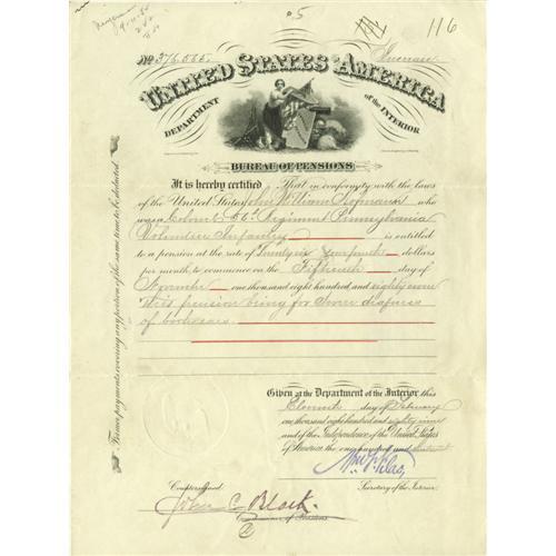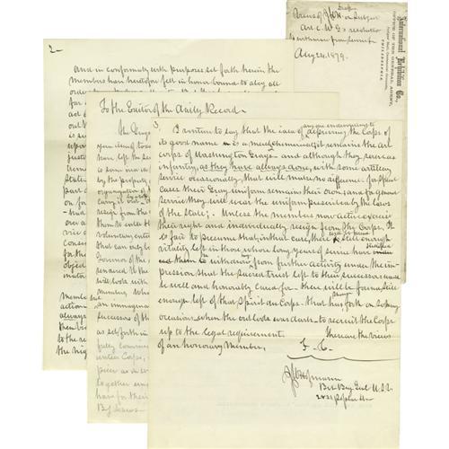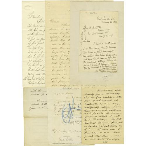 <B>Group Lot of Union Officers' Autographs</B></I> including the following: <BR><B>Thomas Lincoln Casey</B></I> (son of Silas Casey)- 1890 ALS as general regarding his father <BR><B>Charles H. T. Collis</B></I>- 1885 LS and 1892 ALS with Civil War content. <BR><B>Philip St. George Cooke</B></I>- Signature with rank written below. <BR><B>George W. Cullum</B></I>- Two 1853 ALsS. <BR><B>John W. Hofmann</B></I>- 1864 DS, handwritten 1880 speech with initialed printed copy, two 1879 ALsS with military content, 1887 ALS regarding a Battle Flag, his Civil War pension certificate. <BR><B>Gustav Kammerling</B></I>- 1890 ALS regarding his general's commission. <BR><B>John C. Kelton</B></I>- 1887 LS on War Department letterhead, 1858 ALS from West Point. <BR><B>Daniel Ullman</B></I>- Very interesting 1863 LS regarding promotions in his regiment. He says that "<I>the Major, Henry C. Blanchard is totally unfit for command. He is a drunkard, a silly, vain and constant liar...</B></I>". <BR><B>Stewart Van Vliet</B></I>- 1886 ALS <BR><B>Gouverneur K Warren</B></I>- 1861 ALS as colonel NY 5th Volunteers, 1866 LS mentioning General Grant, 1876 LS, 1878 LS, undated ALS. <BR>An interesting lot. Condition generally fine.<BR><BR><b>Shipping:</b> Small Flat (<a target="_blank" href="http://www.heritageauctions.com/common/shipping.php">view shipping information</a>)