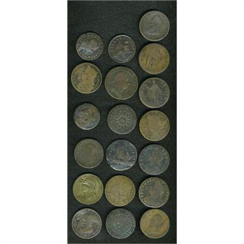 <B>Group Lot of Well Circulated Colonials.</B></I> The lot includes two Fugio cents, five Washington pieces, two Massachusetts cents, four Connecticut coppers, two Nova Constellatios, two Hibernia halfpennies, a Rosa Americana twopence, and a St. Patrick farthing. The grades are Fair to Fine, several pieces exhibit corrosion, and a couple are damaged.<BR><BR><b>Shipping:</b> Coins & Currency (<a target="_blank" href="http://www.heritageauctions.com/common/shipping.php">view shipping information</a>)