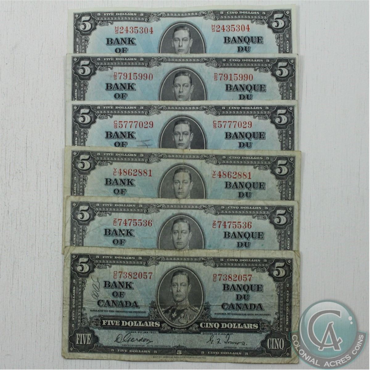 Group Lot of six 1937 $5 Canada Notes. 6pcs