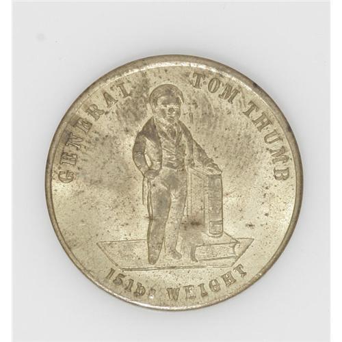 <B>Group Lot of Three Items Relating to P.T. Barnum.</B></I> The first piece was issued in 1862 and is listed on page 741 of the Rulau standard reference as NY-NY 16; it depicts General Tom Thumb. The other two pieces have the same reverse, a standing General Tom Thumb, shown in Rulau as NY-NY 19. One has the obverse of a U.S. Capped Bust gold coin, while the other has a likeness of Queen Victoria. It is believed these were used in some type of game as a counter and as an advertising piece.