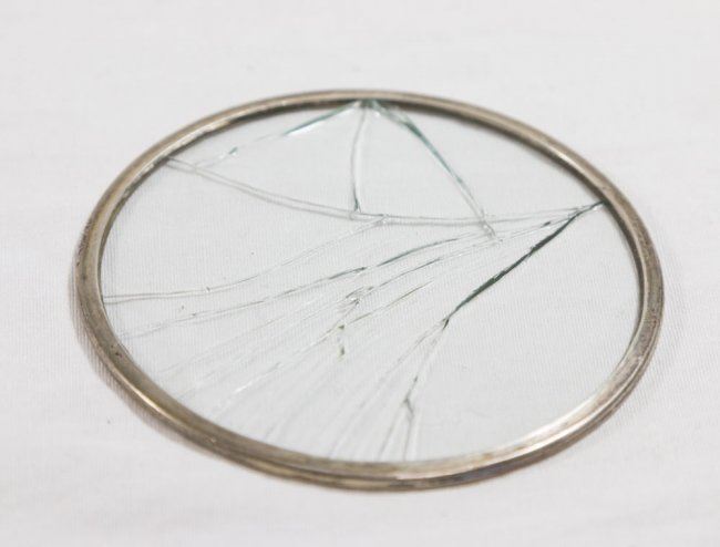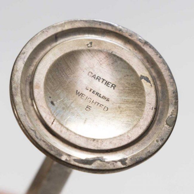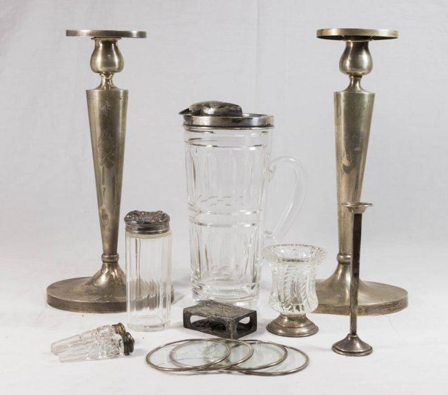 Including crystal decanter with sterling silver lid, pair sterling silver etched candlesticks, approx. 11 1/4" H. Sterling silver bud vase, approx. 5 1/4" H. Sterling rimmed toothpick holder, approx. 3" H. Sterling silver rimmed & crystal jar from cutting set. 2 cutglass snuff bottles with sterling lids. 4 sterling rimmed coasters, approx. 2 7/8" diameter. Chinese silver match safe with bamboo serpent on one side and bamboo tree on reverse. Dings & twists on candlesticks.