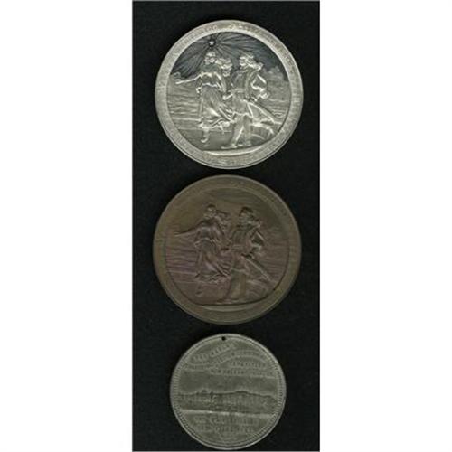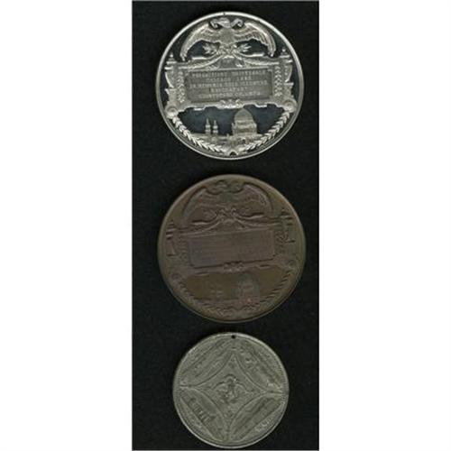 <B>Lot of Three 19th-Century Medals.</B></I> Included are a <B>Pair of 1892 Columbian Exposition Medals in Copper and White Metal,</B></I> 65mm, listed as Rulau X11 in his book <I>Discovering America.</B></I> Obverse: Columbus and a robed female stride left on deck of his ship; a radiant star in the sky. Around: Chicago 21. Octbr. 1892./ Guanahani 12. Octbr. 1492. Reverse: (In Italian) Esposizione Universale / Chicago 1893 / In Memoria Dell Illustre / Navigatore / Cristoforo Colombo. With ornate rectangular cartouche, spread eagle above, exposition buildings below. Both XF, plain edge. Both signed N. Fristrup, Inv. F. Schmahlfeld SC. V. Christesen. Also included is an <B>1884 Cotton Centennial Exposition Medal in White Metal.</B></I> 50mm, holed. Buildings from the exposition on both sides; writing on both sides rubbed moderately. F, plain edge. <BR><BR><B