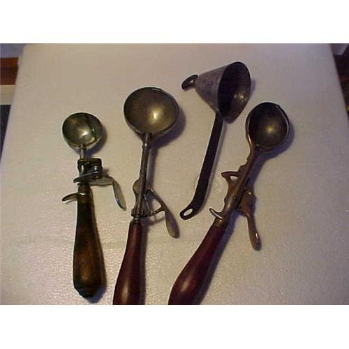 Scoops,Ice Cream (4); 3 wooden handles; (1) all metal; 3 sizes.working, good action, needs cleaning.