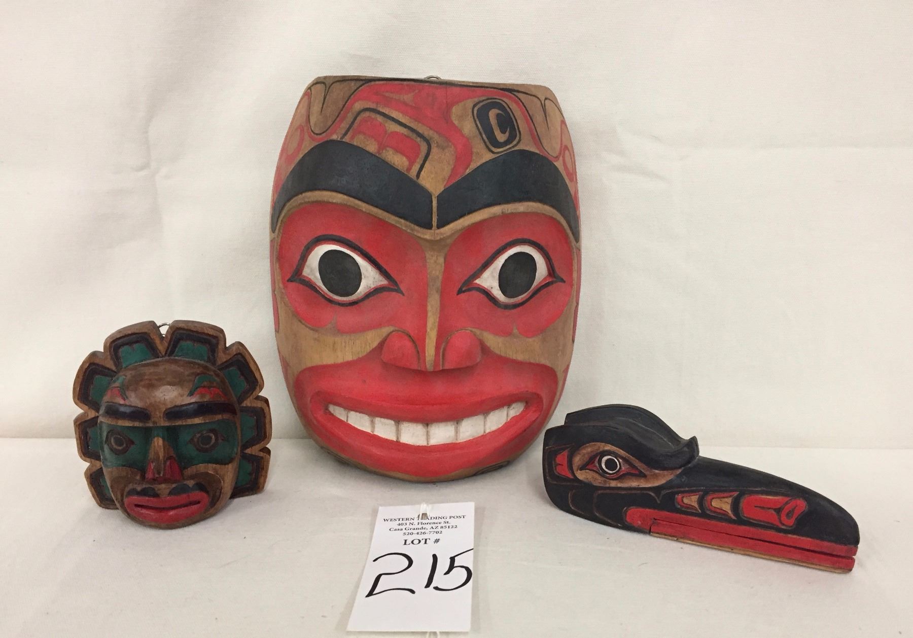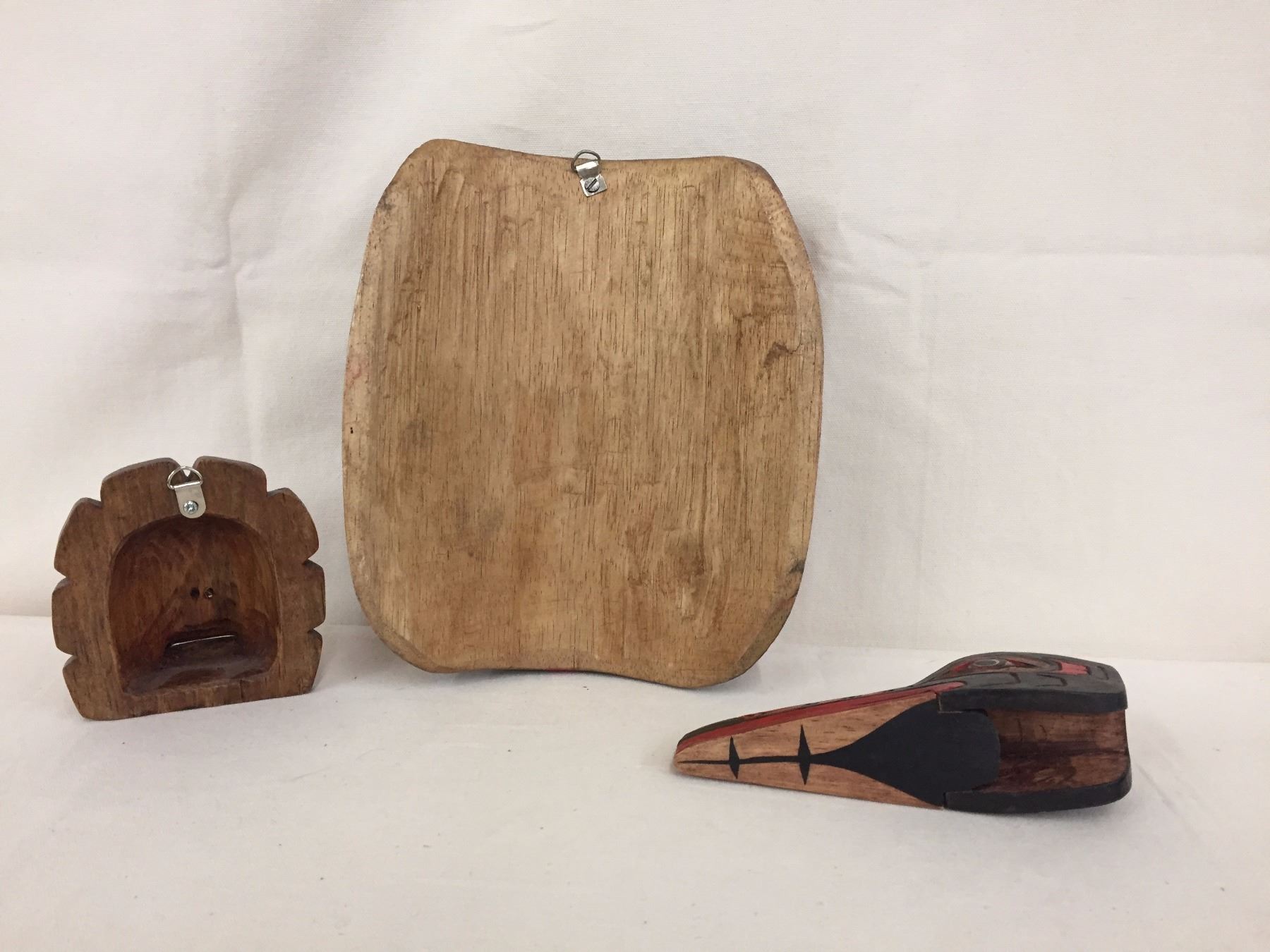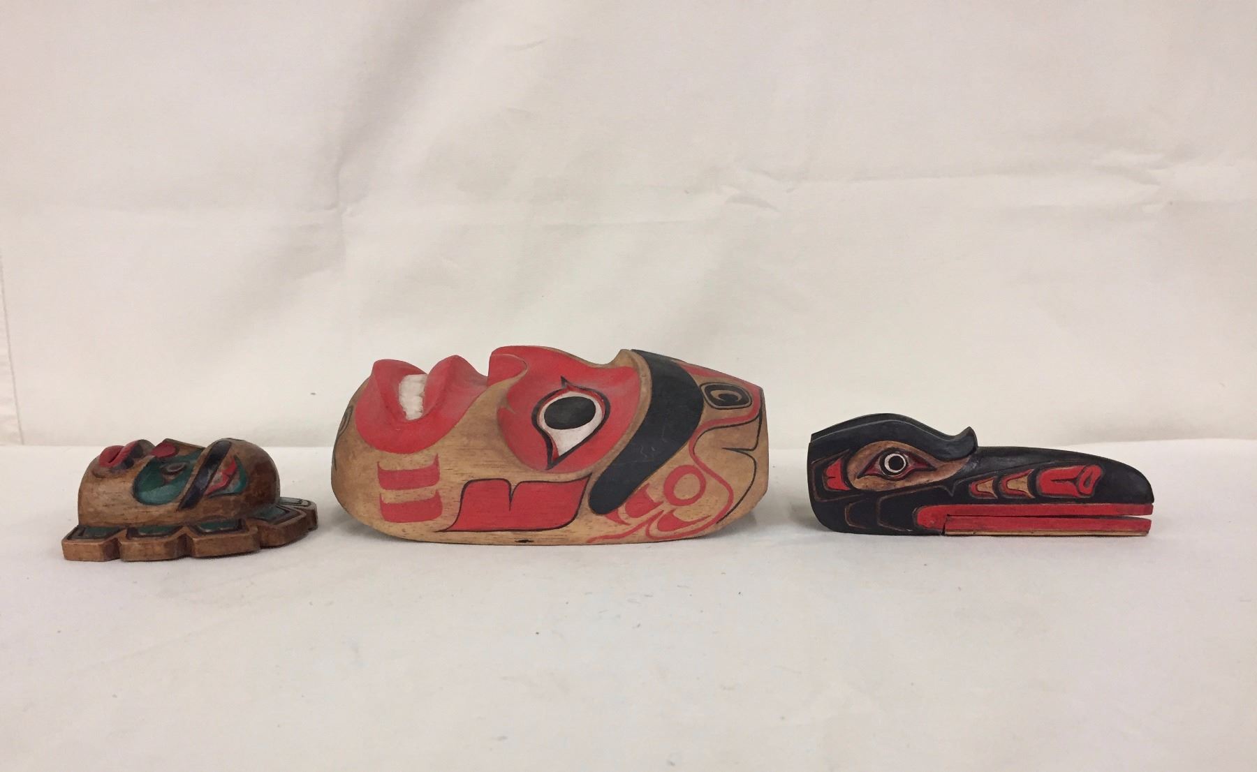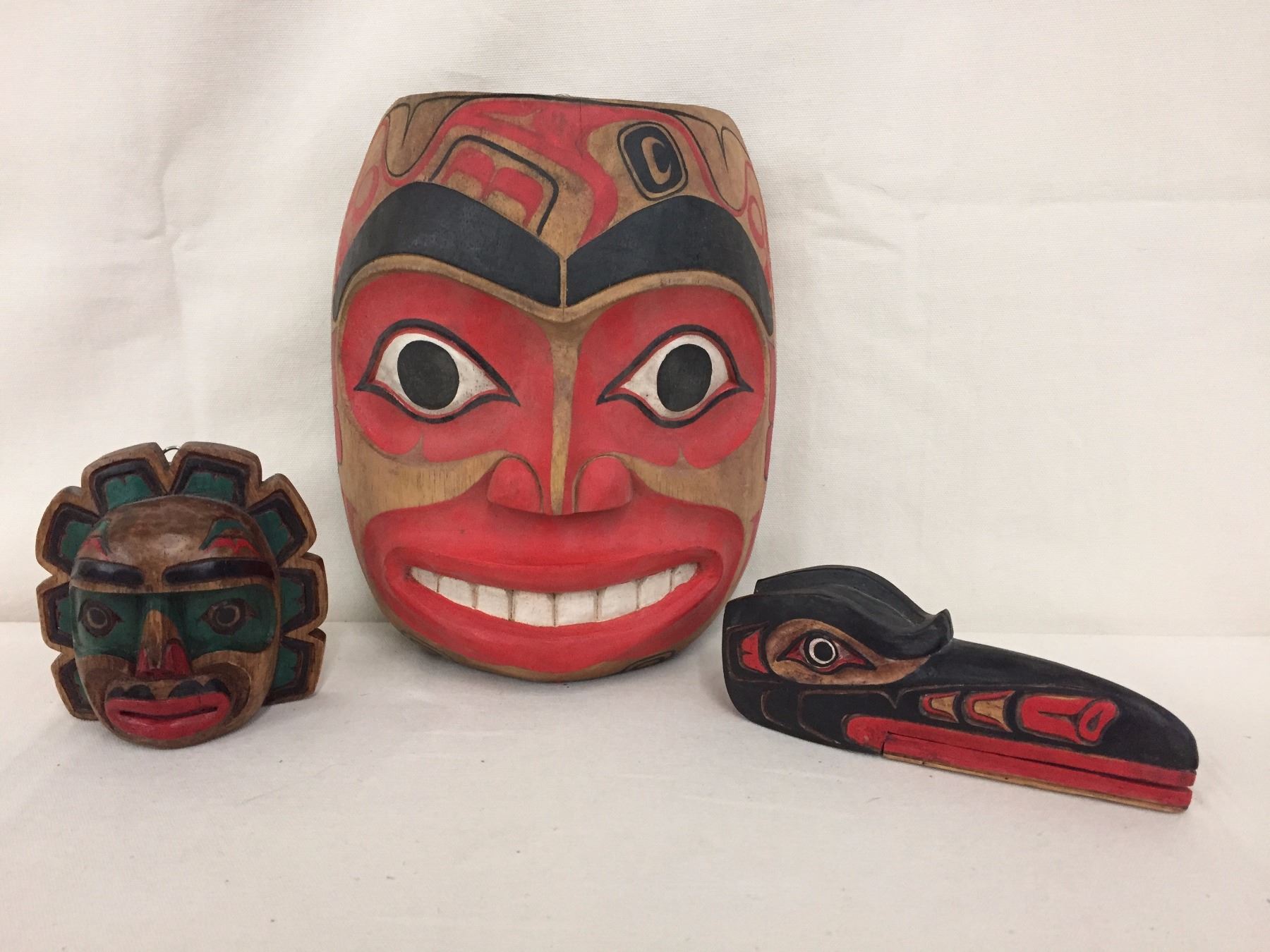 Description: A group of 3 different Northwest coast carvings, including a large and small, wall hanging mask and a nice bird head carving. Maker: Various, none appear to be signed. Approx. Age: Vintage. Size: From 73/8” w x 8 5/8”h. to 3 7/8”w x 4”h. Condition: Good for their ages, normal wear expected. Please look closely at the pictures - they are an important part of our description. Shipping: There will be a $7 handling / packaging fee for shipping this lot. The actual cost of postage will be added on top of that.