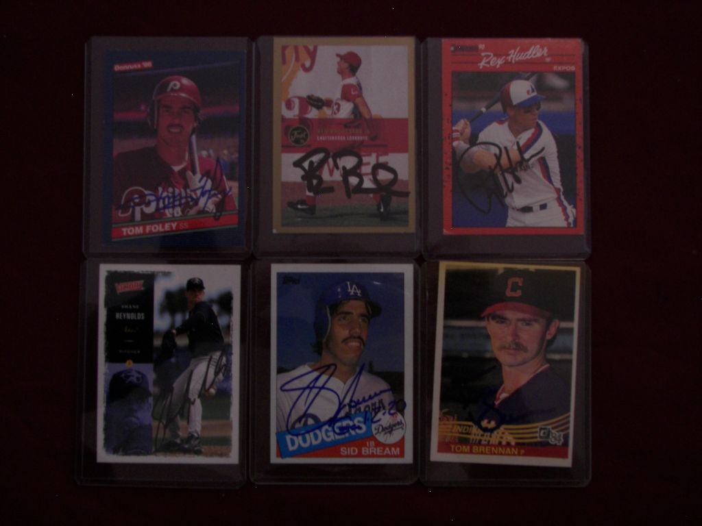 (7852) Group Of 10 Autographed Baseball Cards, Tom Brennan (84 Donruss), Sid Bream (85 Topps), Rex Hudler (90 Donruss), Ben Broussard (2000 Just M.), Tom Foley(86 Donruss),Shane Renyolds(2000