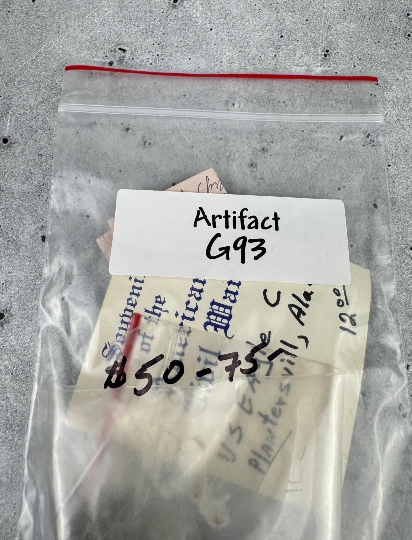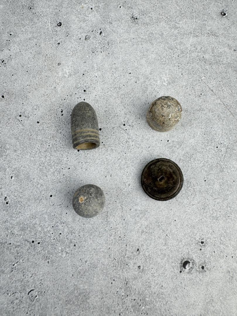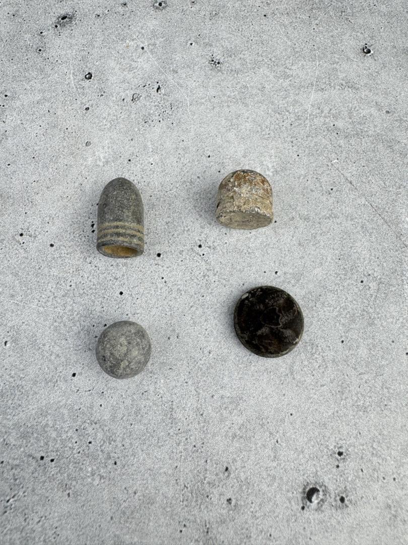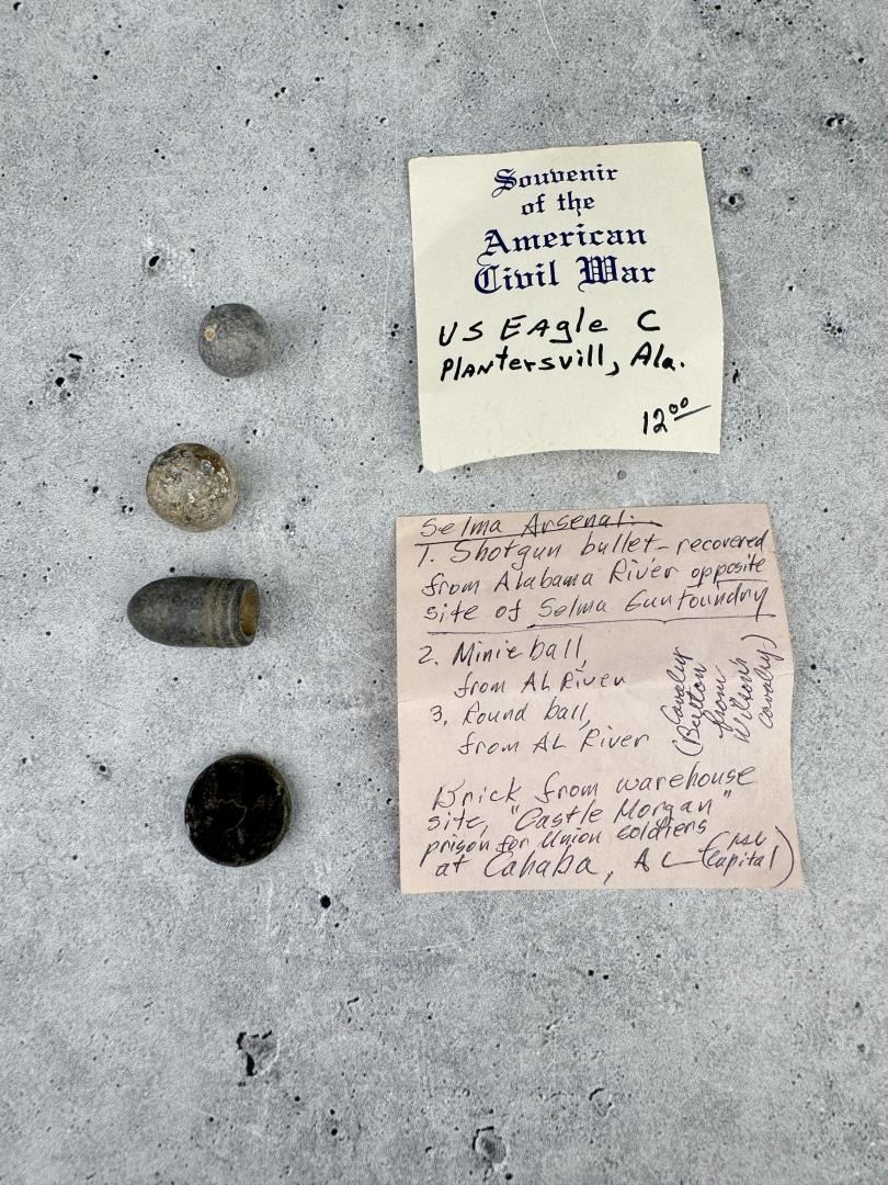 Consists of three bullets and a Union cavalry button. Attribution is Plantersville Alabama.