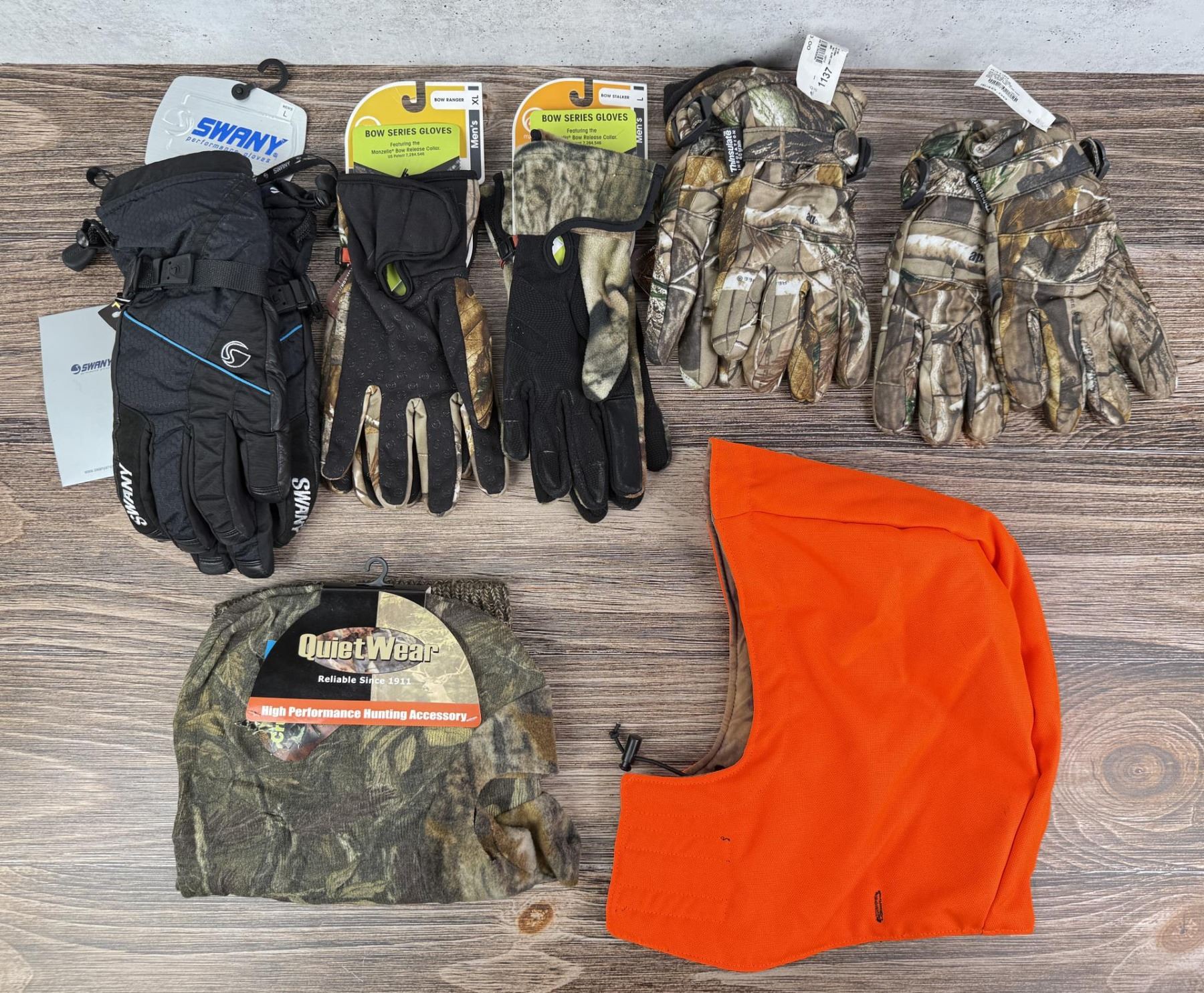 Lot includes five pairs of gloves, a blaze orange hood, and a neck gaiter. sizes vary.