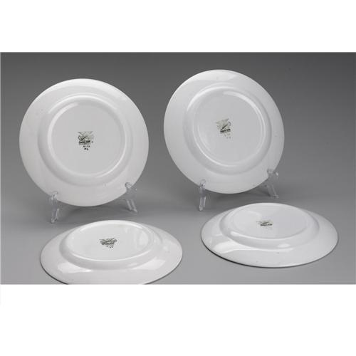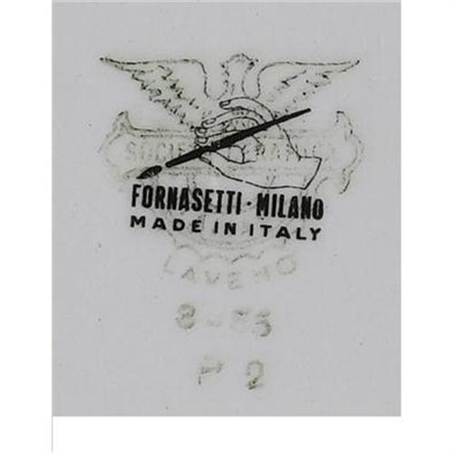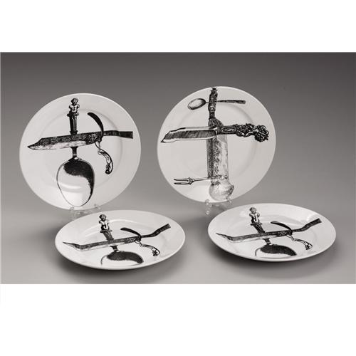 <B>A Group Of Four Italian Ceramic Plates</B></I><BR><BR>Piero Fornasetti, Milan, Italy<BR>Circa 1950<BR>Ceramic and enamel<BR>Marks: each stamped with mark for <I>Societe Ceramica / Laveno / 10-55 / E2,</B></I> with an overstamp <I>Fornasetti Milano / Made In Italy</B></I><BR>9 in. diameter (each)<BR><BR>Each white ceramic plate transfer decorated with various black utensils, three identical