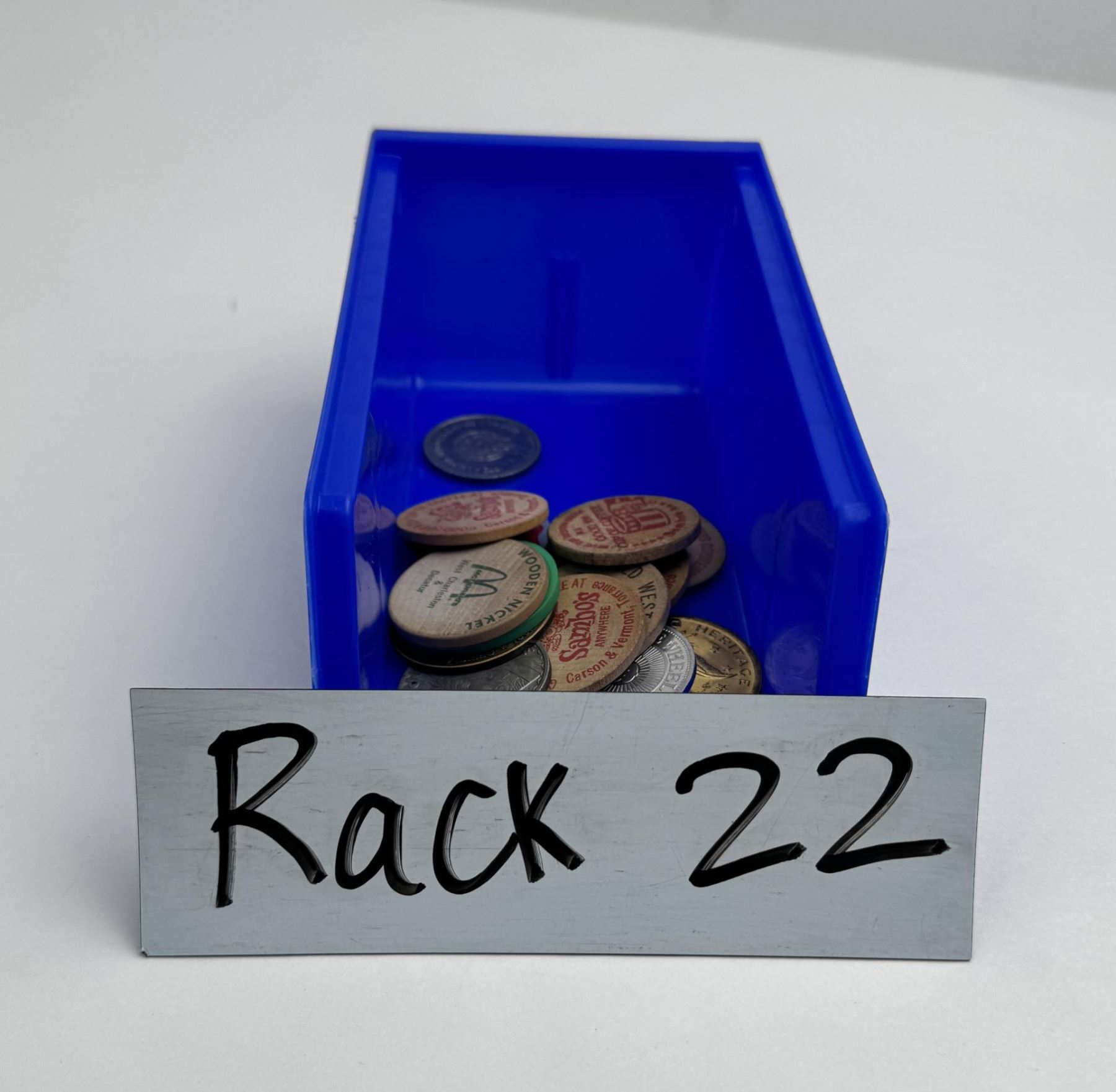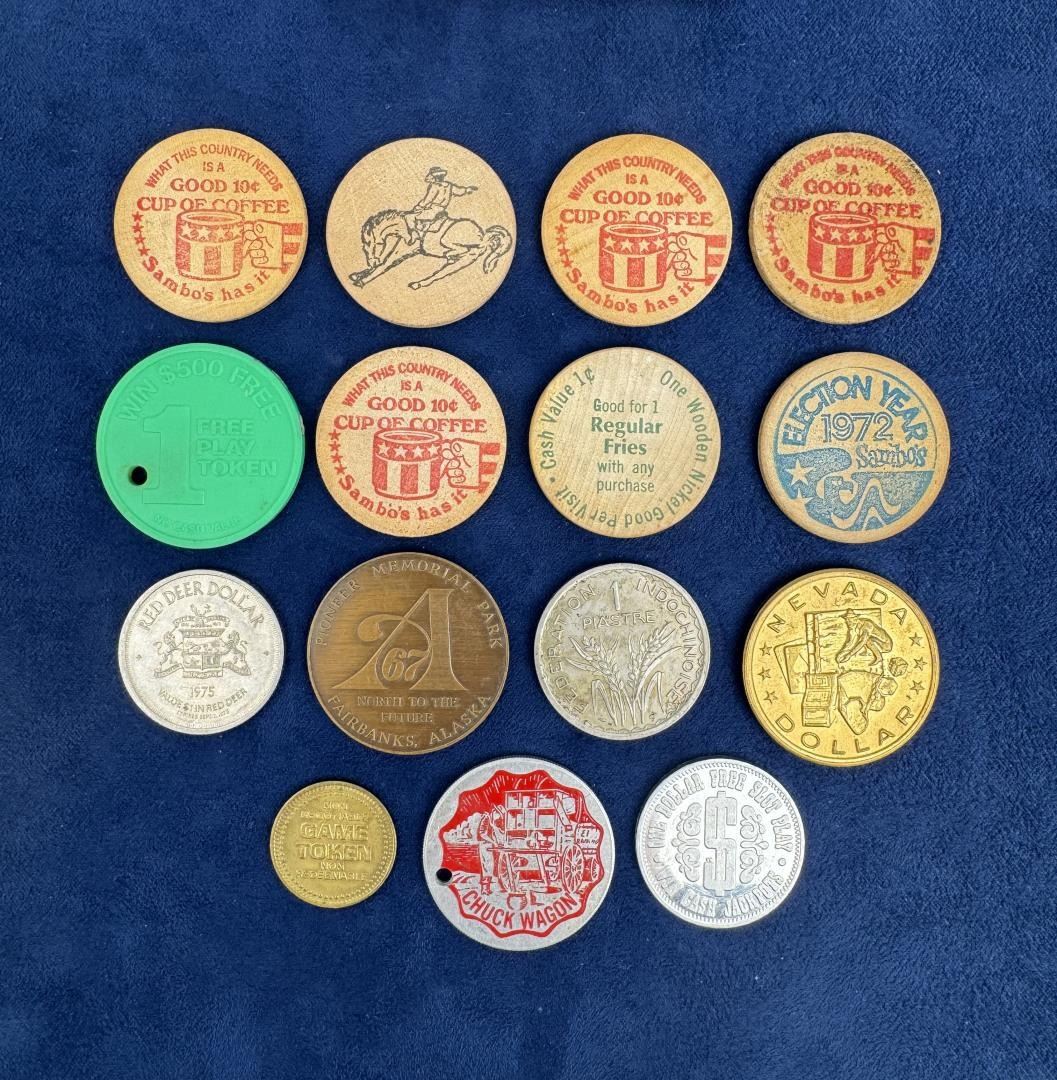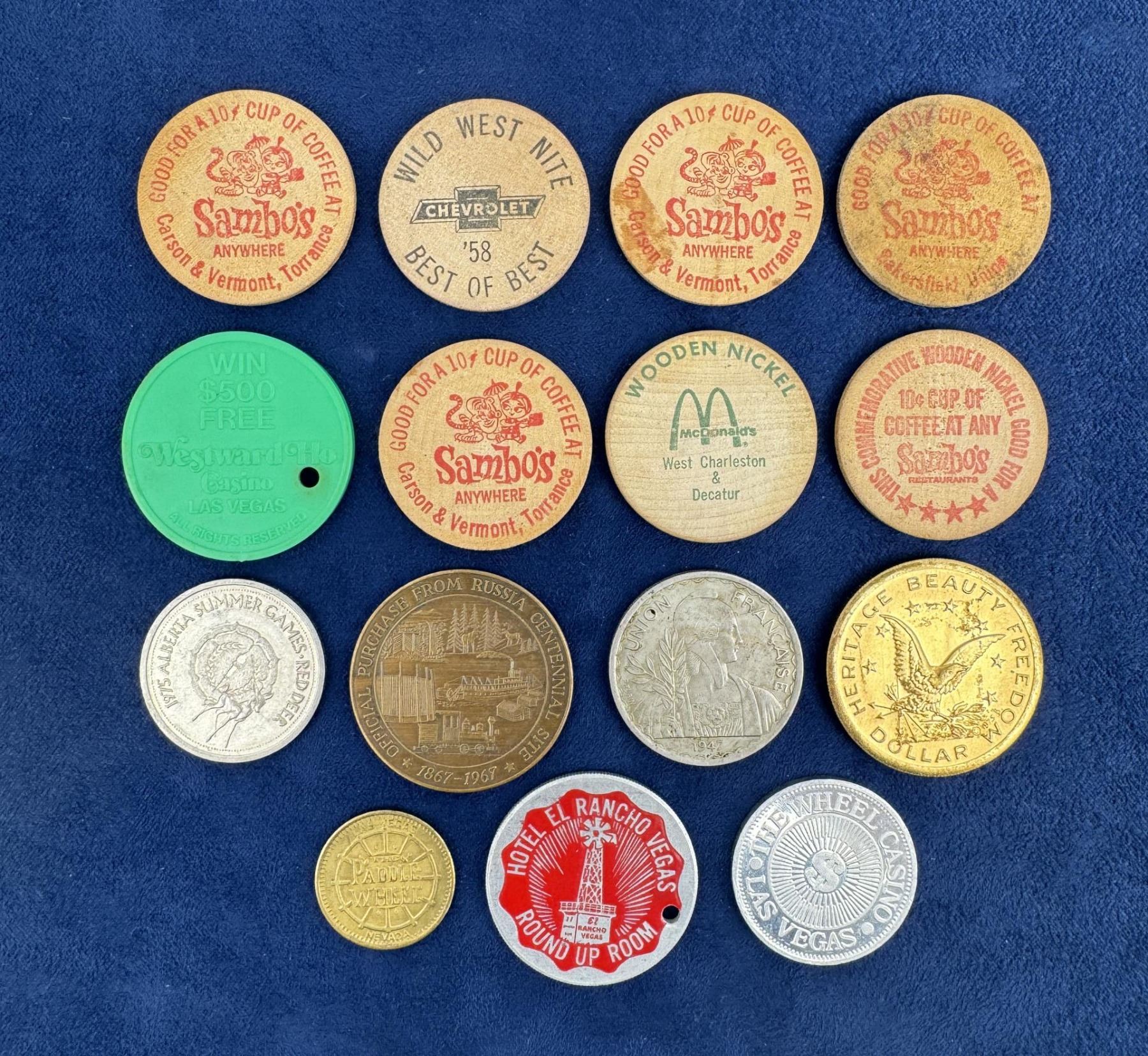 Wooden nickels, tokens, coins, medals. One fairly scarce aluminum token from the Hotel El Rancho Las Vegas.