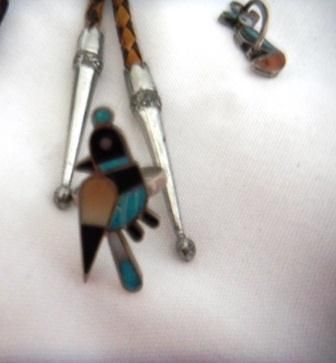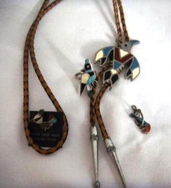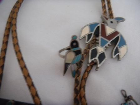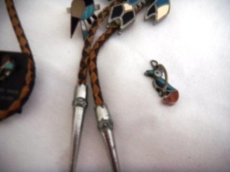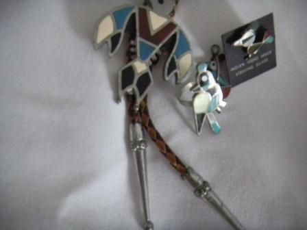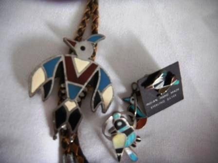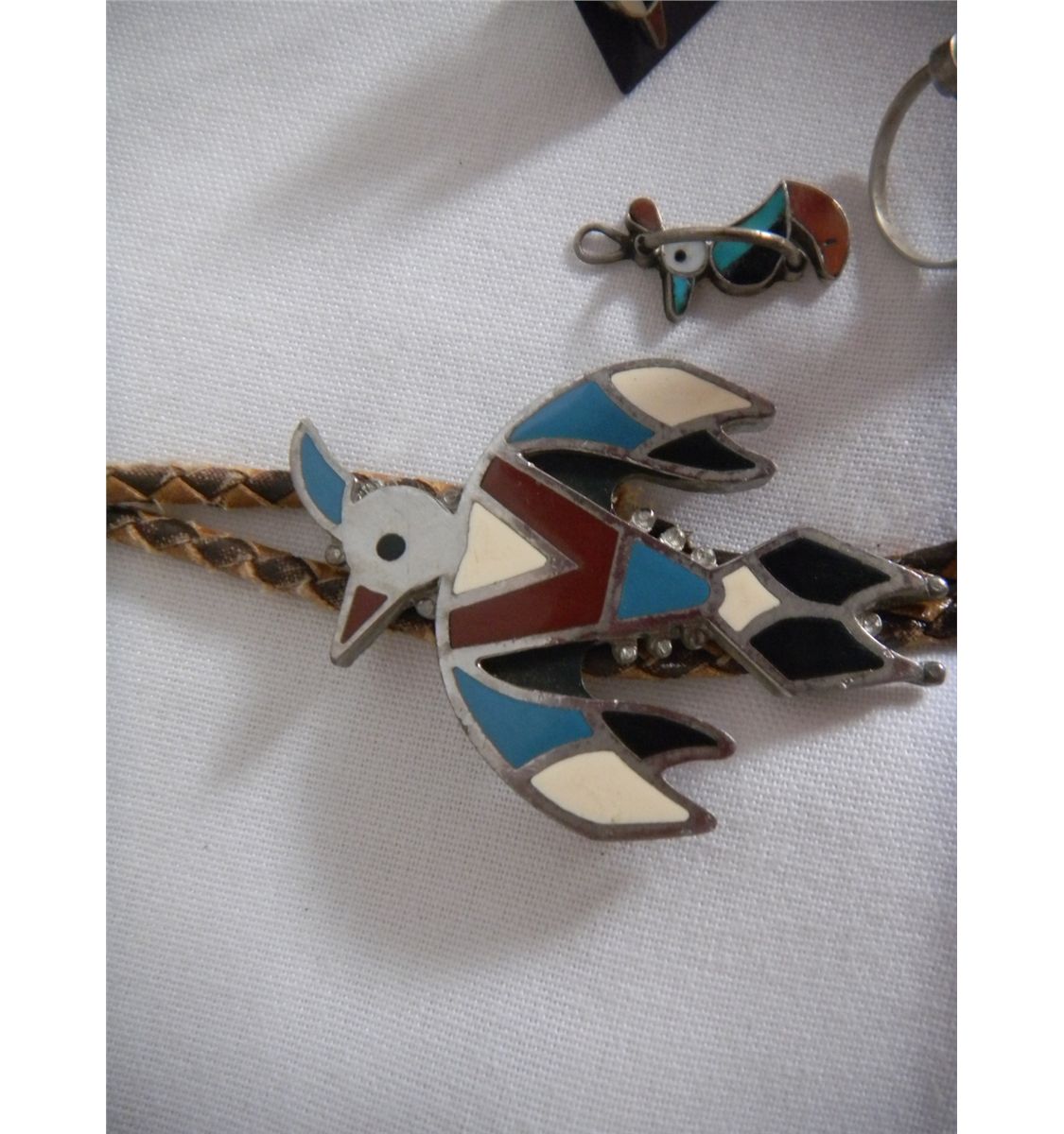 Group of Zuni Items to include a bolo of Thunderbird Bolo with leather bolo string. Bolo tie is not sterling. Also included are a sterling small bird ring, Sterling small bird pendant and zuni bird tie tack. Shipping $15.00 ,