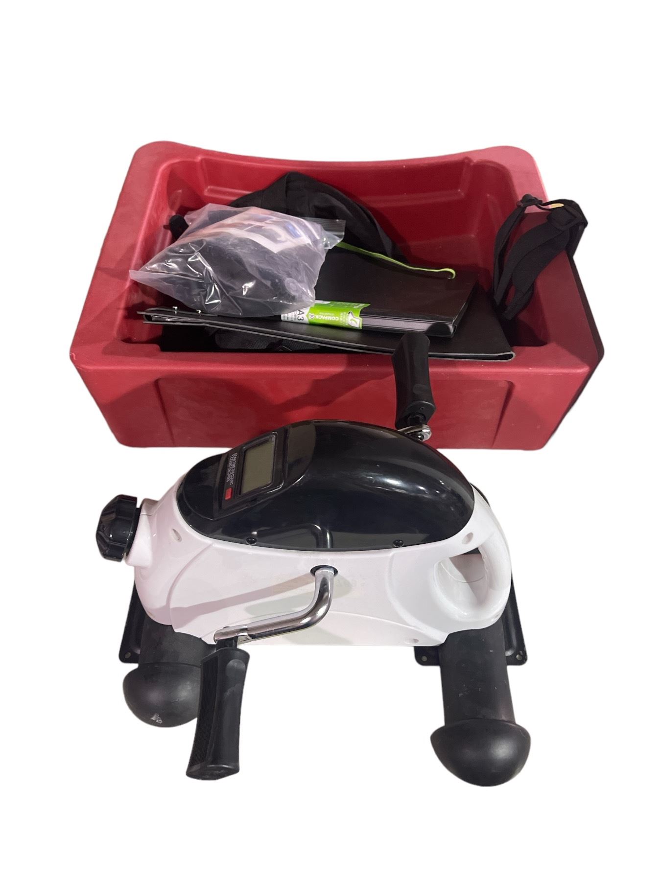 Group lot - Mini Stationary exercise bike w/ plastic bin w/ binders & rotocast