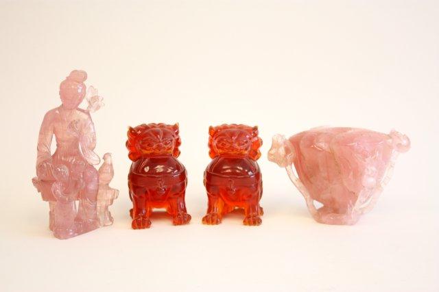 1-4.75" H pair amber food dogs. 1-4" x 6" rose quartz pen holder/vase. 1-7" H (without stand) rose quartz "Quan Yin".