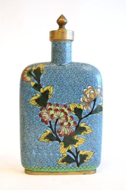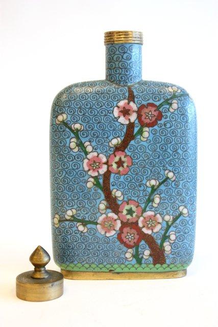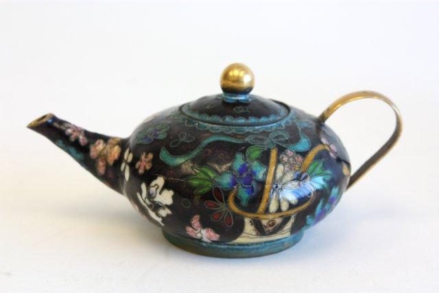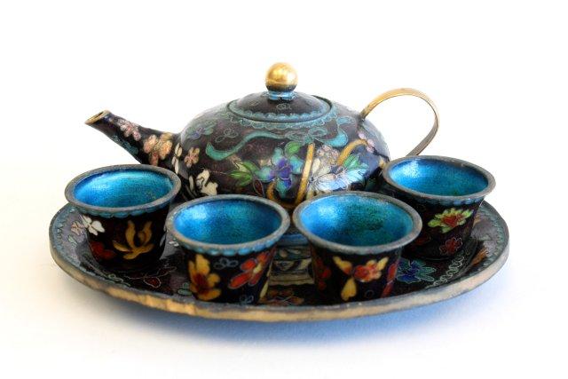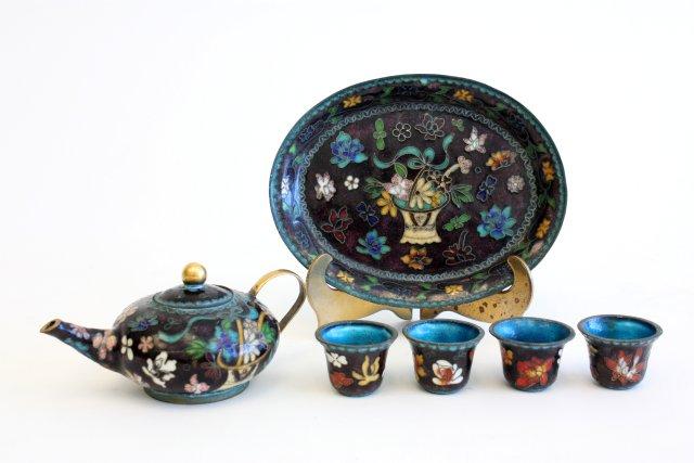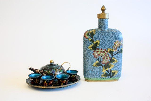 1-7.5" H Cloisonne flask & cabinet size cloisonne teapot, 4 cups & 1-tray.