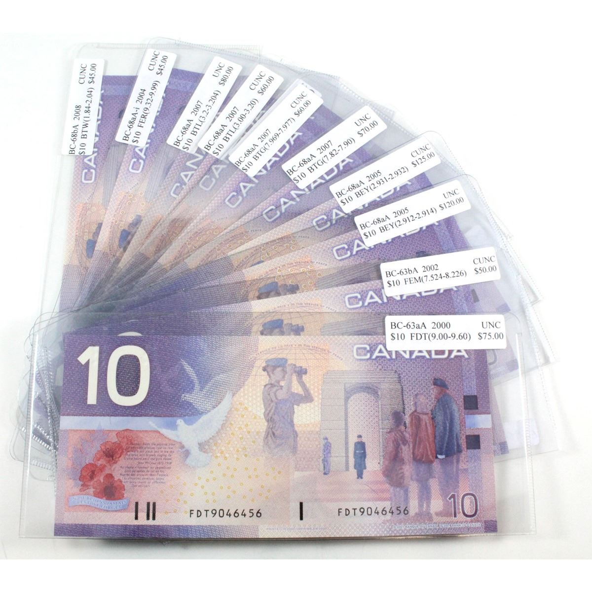 Group lot of 11 Different Insert Replacement $10.00 Notes in UNC or Better Condition. Years range from 2001 to 2005. Buyers Premium will be added on all items as per our terms of sale. We accept Paypal, Credit Card, E-Transfer Payments, Cheque or Money Orders (there is an additional 3% fee for using Paypal or Credit Card). All invoices will be emailed immediately following the auction, please contact us if you would like to pay by credit card or receive a new revised lower total for mailing in payment or sending an e-transfer (3% discount). All Items Are Sold "AS IS", no returns