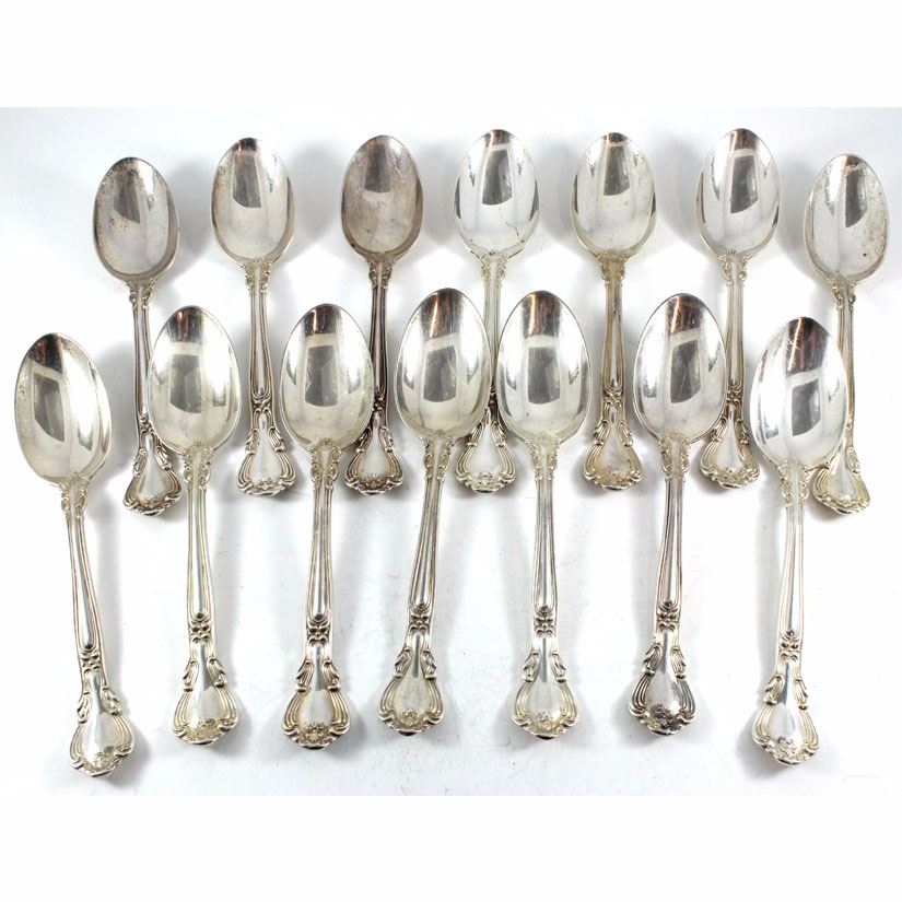 Group lot of 14x Birks Chantilly Design Sterling Silver Dinner Spoon Set. Weighs 706 grams