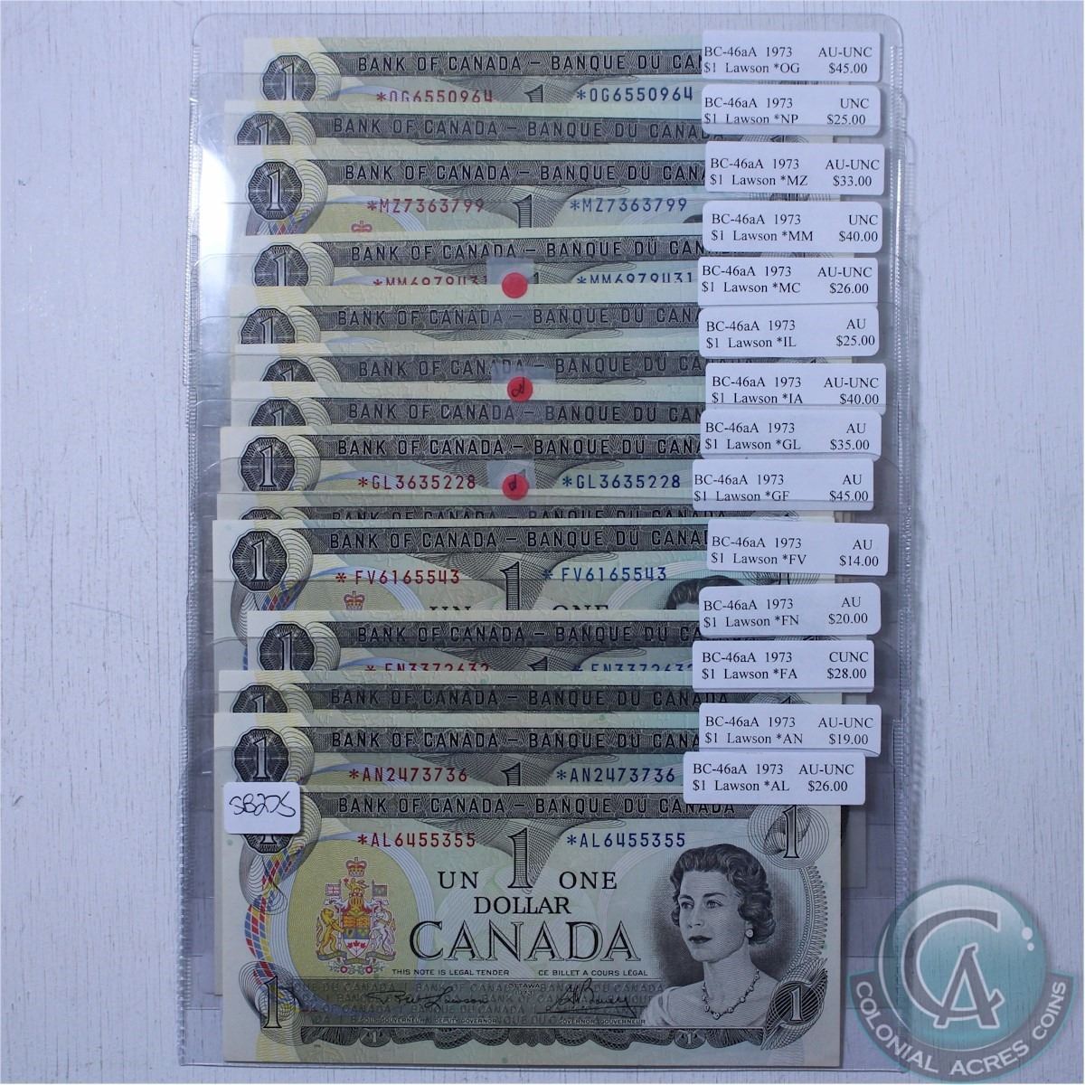 Group lot of 1973 Replacement $1 AU or better; prefix's *AL, *AN, *FA, *FN, *FV, *GF, *GL, *IA, *IL,
