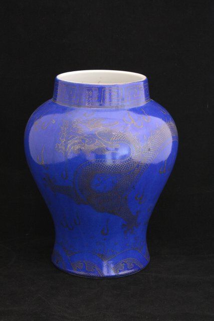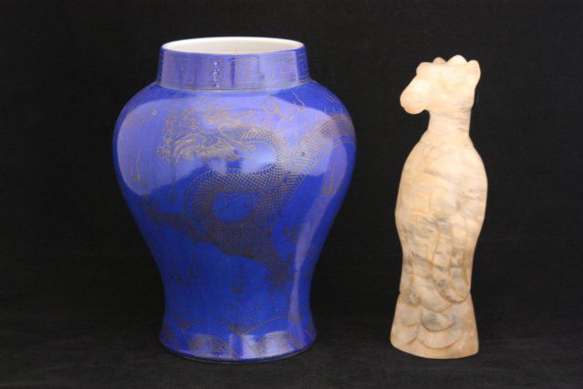 1- Chinese Qianlong gilt decorated blue glazed jar, approx. 11" x 5" Diam. 1- Stone figure of a "Horse", approx. 10.5" . Please read our terms of sale.