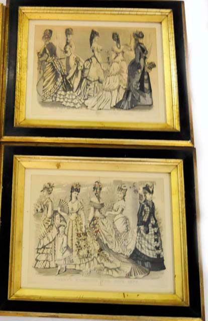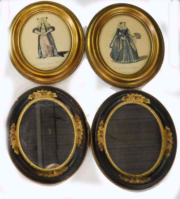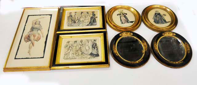 Pair "Fashion" prints, pair prints, single print & pair oval mirrors. Mirrors approx. 14" H x 11.5" W. Please read our terms of sale.