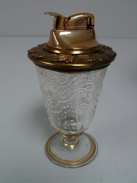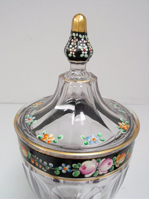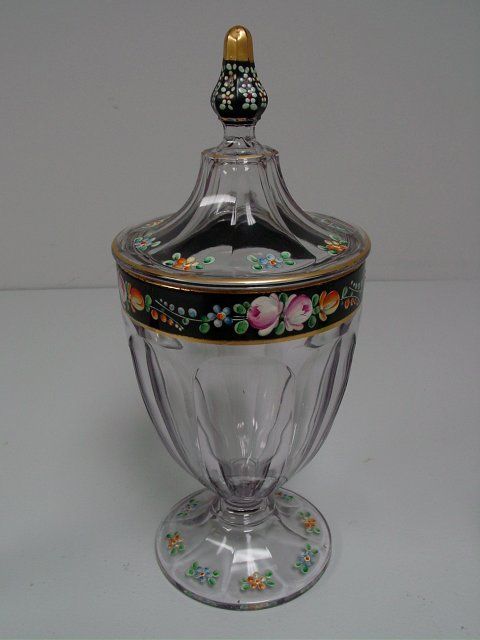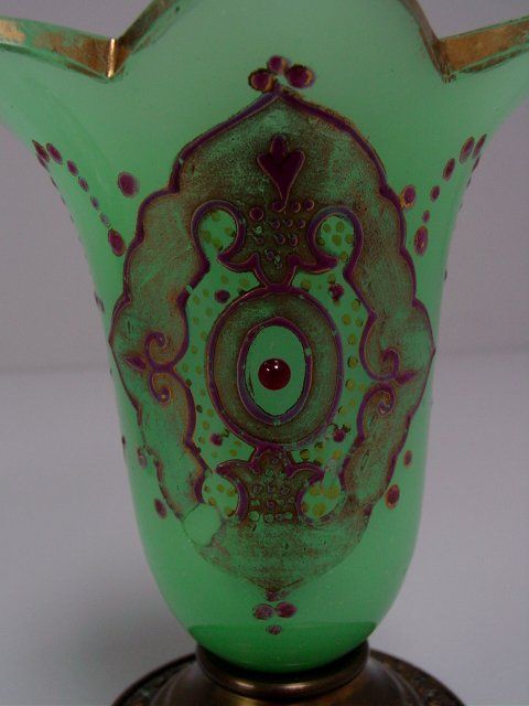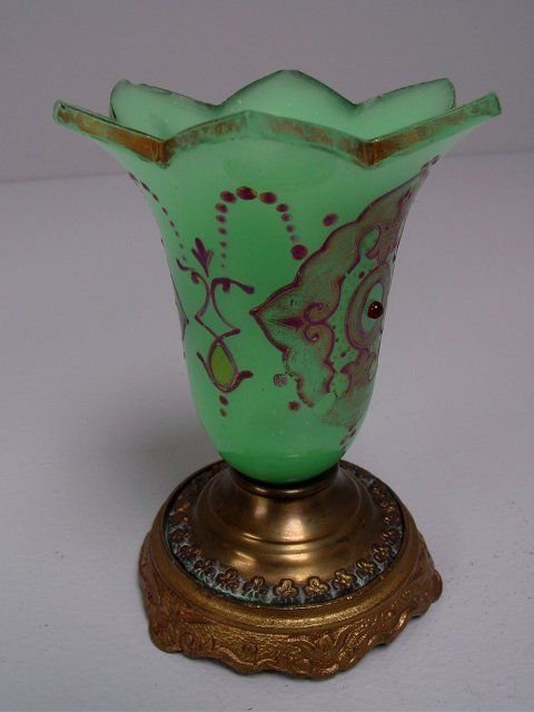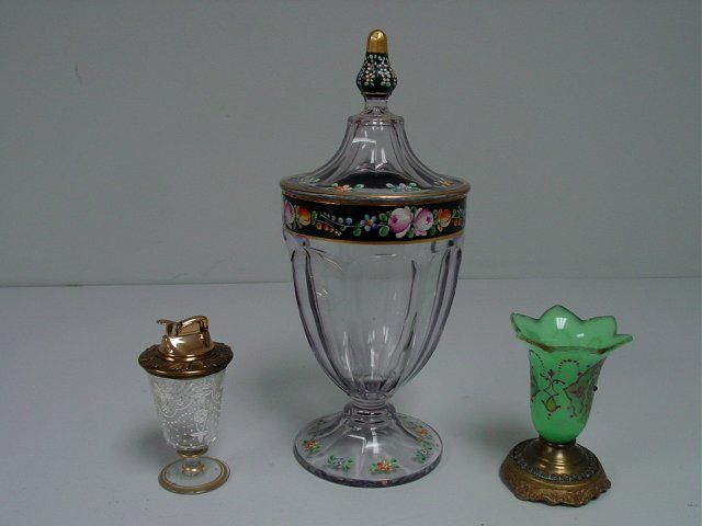 Including: 1- Heisey hand painted covered jar, approx. 13.75" H. 1- Enameled glass cigarette lighter with metal mount, approx. 5.5". 1- Green glass vase with enamel & stones & metal mount, marked Bronze Art Craft, approx. 5.25".