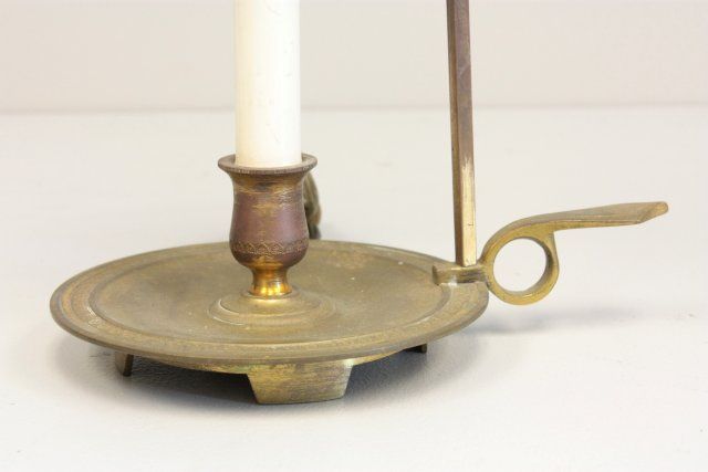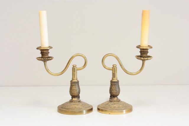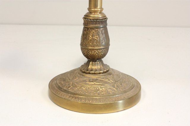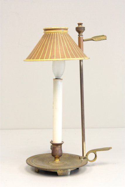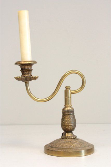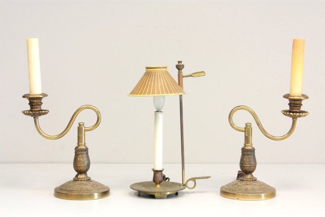 1- Bronze candlestick lamp with shade, approx. 15" H. 1- Pair brass gooseneck table lamps. Please read our terms of sale.