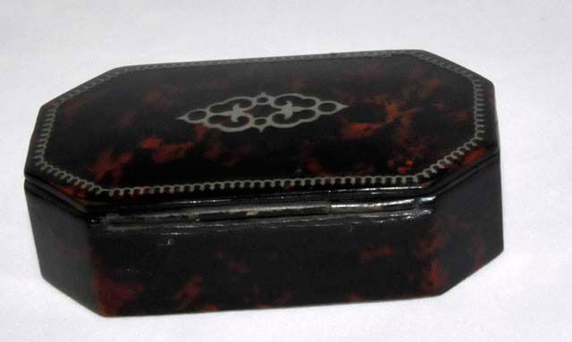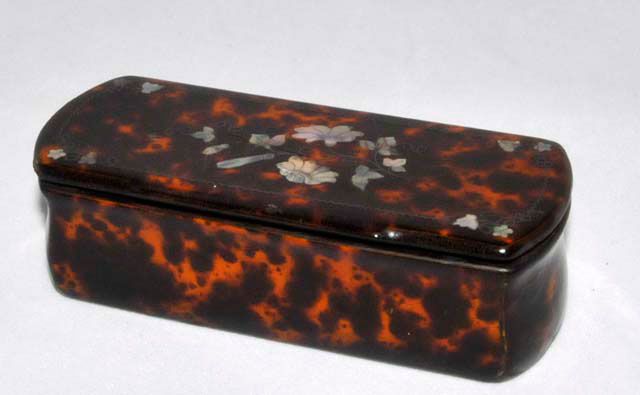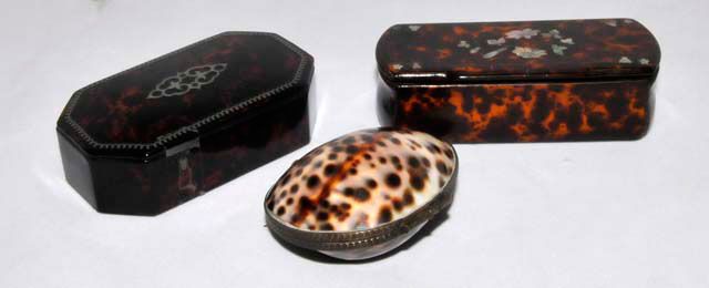 1- Shell box with seahorse clasp, approx. 2 1/2" W x 2 1/8" D. 1- Box with mother of pearl inlay, depicting "Flowers", approx. 4" x 1 1/2". 1- Tortoise box with silver overlay, approx. 3 1/2" x 1 3/4".