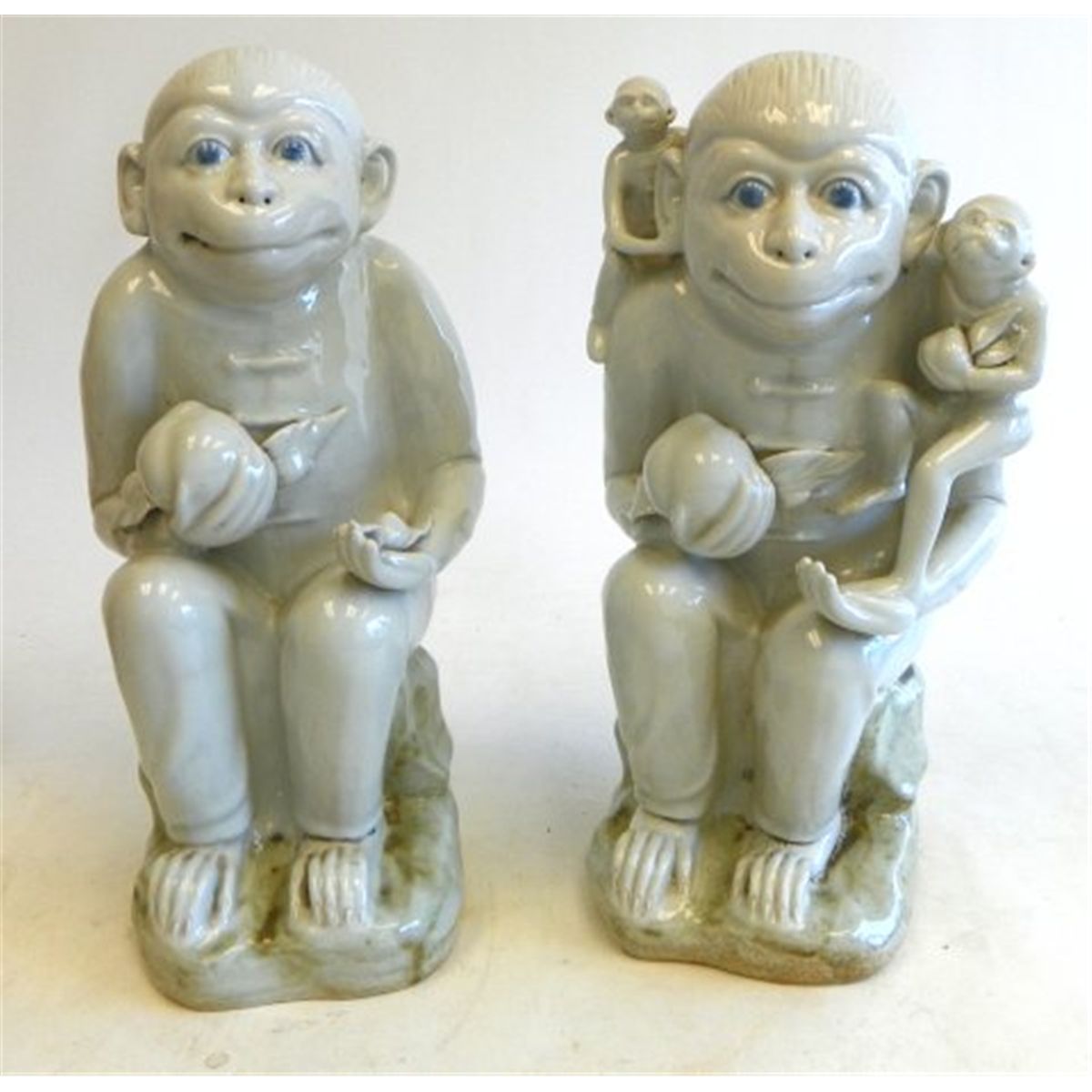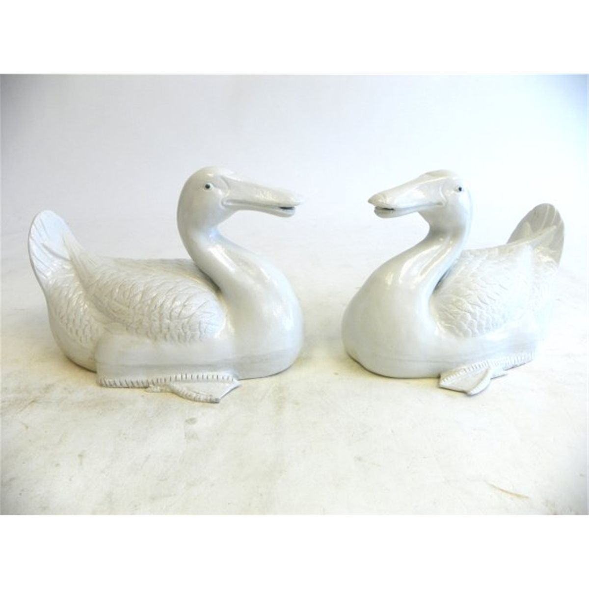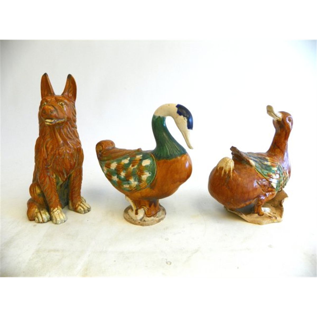 1- Pair white porcelain with "Monkey" motif, approx. 15" x 7". 1- Pair white porcelain "Ducks", approx. 11" x 8". 1- Pair Sancai "Ducks", approx. 12 x 9.5". 1- Yellow glazed "Dog", approx. 14" H.