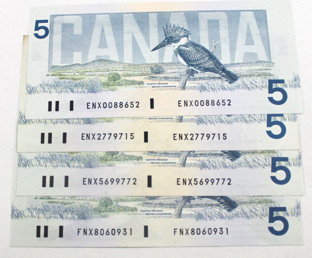 Group lot of 4 x 1986 $5 second generation replacement notes. BC-56aA, BC-56aA-i, BC-56bA ENX, BC-56bA FNX. Notes are in EF-AU or higher.